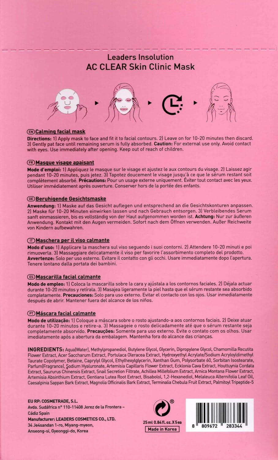 Leaders Insolution AC Clear Skin Clinic Mask | Snail Secretion & Tea Tree Oil for Acne, Redness, Oil Control | 100% Cotton Bemliese Sheet | Balances & Soothes Sensitive Skin (10 Sheets)