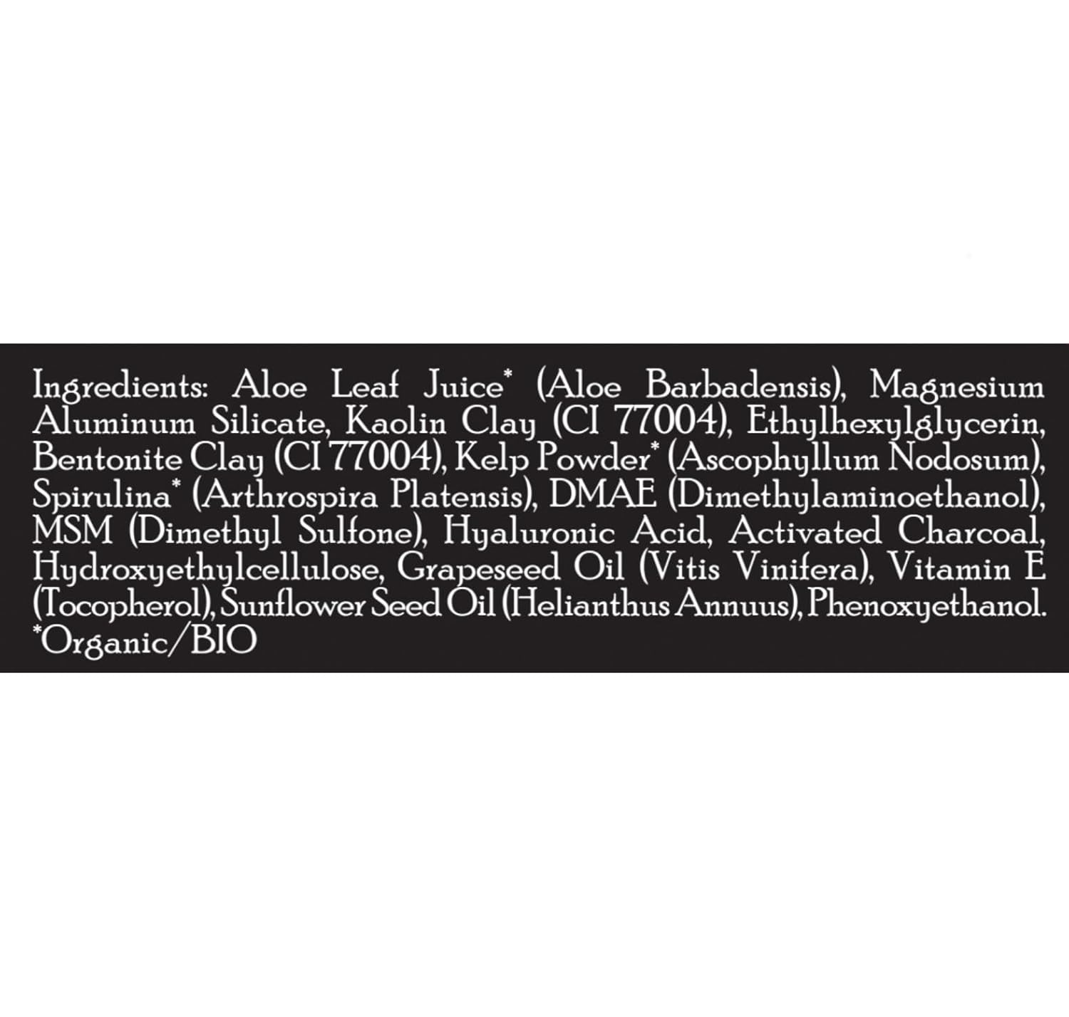- Key Ingredients: Natural & Organic ingredients, including Activated Charcoal, Kaolin Clay, Bentonite Clay, Kelp, DMAE, MSM, Hyaluronic Acid, Aloe Leaf Juice, & Vitamin E.