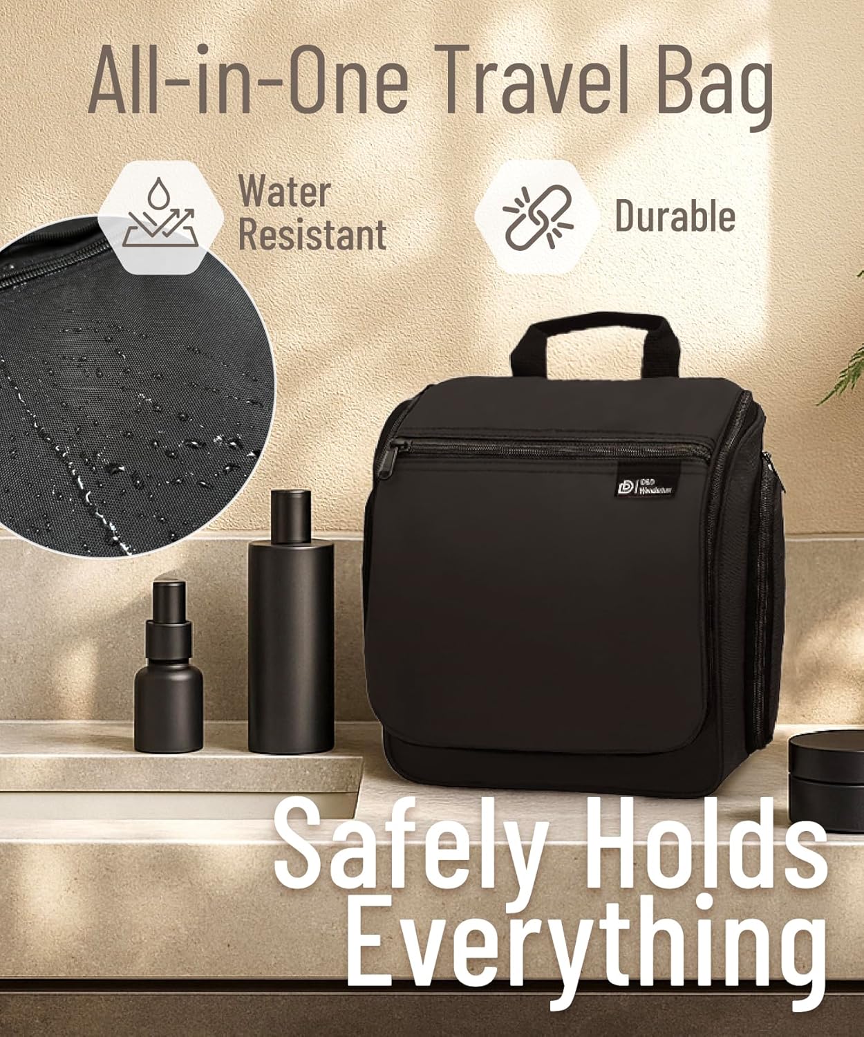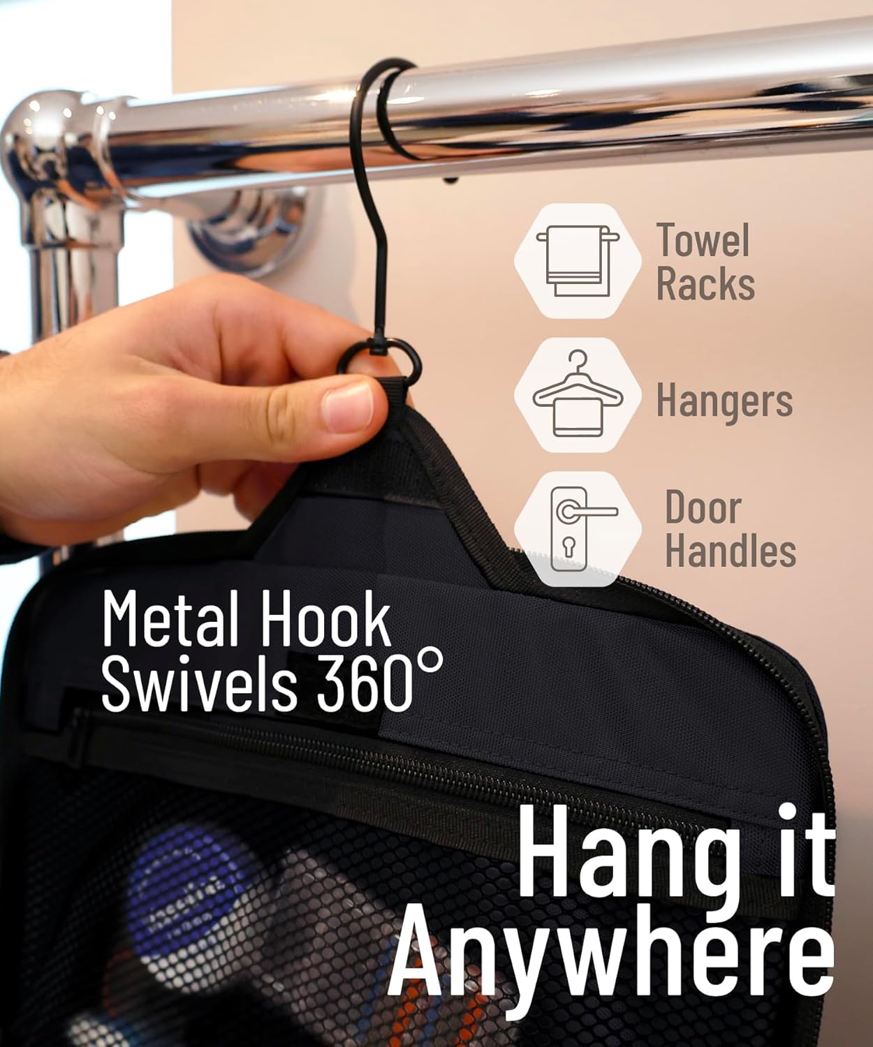 • Convenient Hanging Hook: The XXL metal swivel hook allows you to hang the bag anywhere, saving valuable counter space. It's perfect for use in hotels, bathrooms, or even on a camping trip.