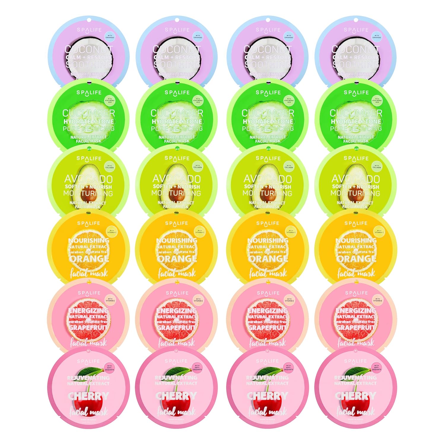 SpaLife Beauty Fruit Facial Sheet Masks 24 Pack – Face Masks Skincare Set – Hydrating Face Masks – 6 Natural Fruit Extract Formulas – Orange, Grapefruit, Coconut, Cherry, Avocado, Cucumber