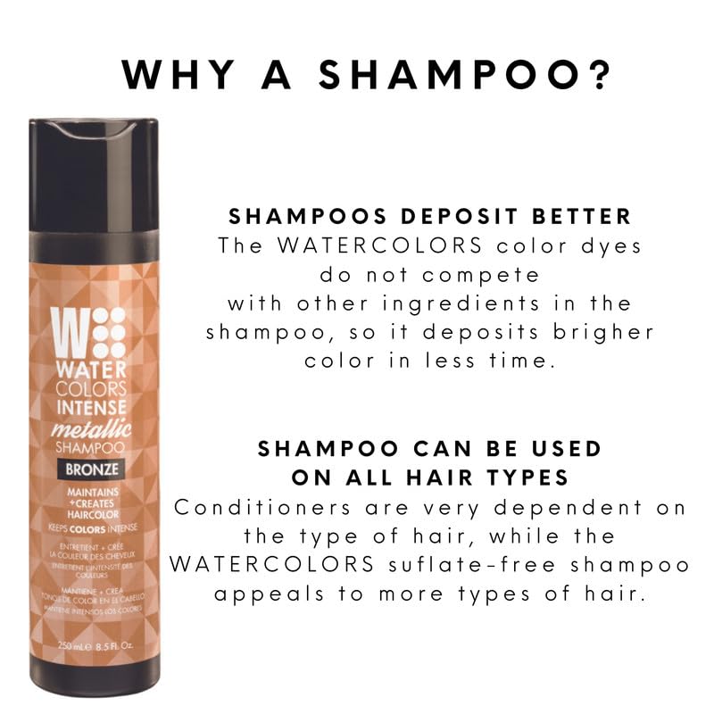 • What Makes Watercolors Shampoos Unique? 3-in-1 Color Depositing Shampoo - Cleanses, Conditions and Refreshes Color: Replace the color that has faded from your hair. Intensify while cleansing and conditioning with every wash. Restore and Rejuvenate color treated hair in one wash