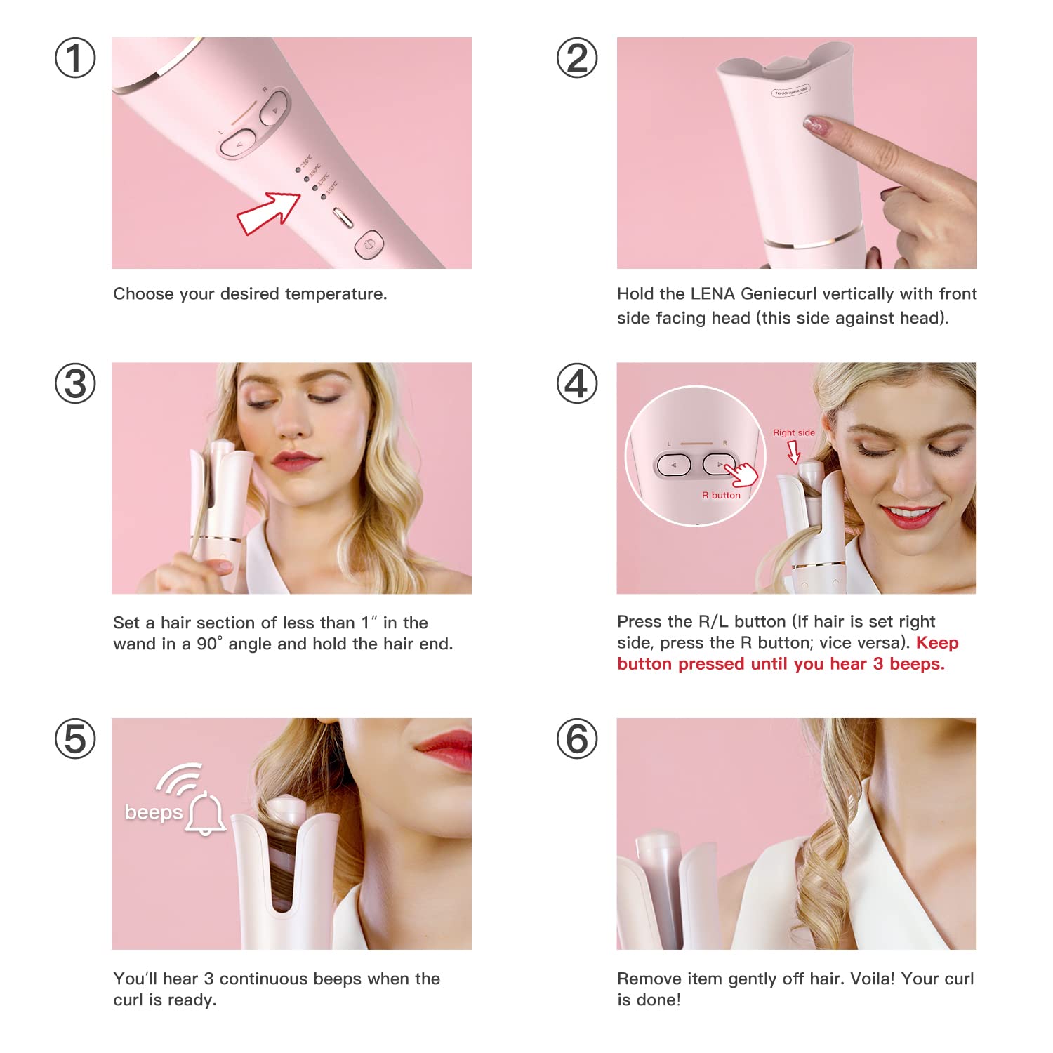 - đăEASY CURLER FOR LONG-LASTING RESULTă Perfect curls in just 3 simple steps - 1. Set your hair in the wand; 2. Push the spin button; 3. Take your hair out after the beep. Complicated hair styling made simple and suitable for users of all ages with or without any experience. Follow instructions and enjoy your new look in minutes. NOTE: Use with hair without any hair protectant.