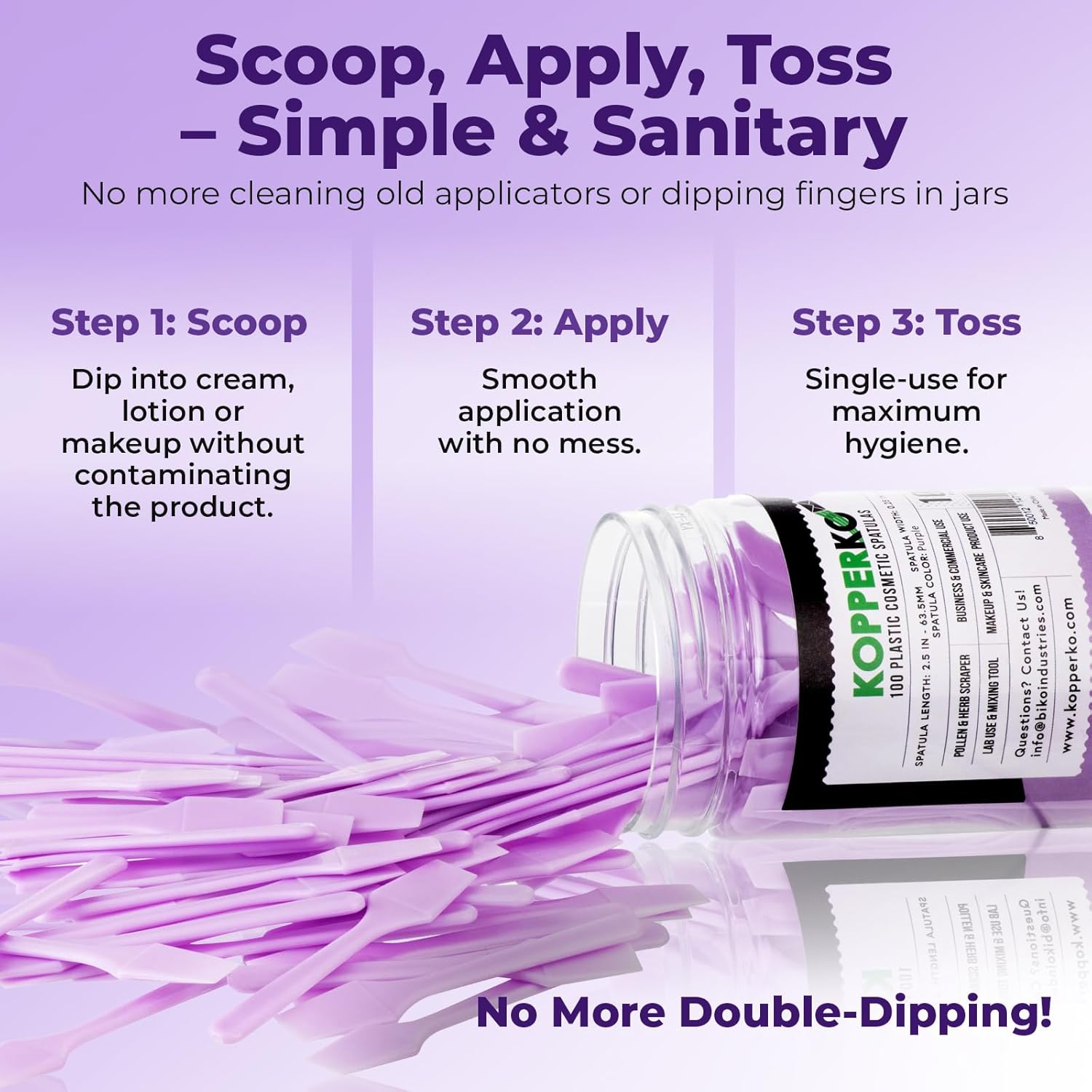 • Clean Out Your Containers: Maximize product use with our 100 pack of 0.25"x2.5" disposable cosmetic plastic spatulas. Easily extract creams, lotions, or makeup from containers, even in tight spaces, without getting product under your nails