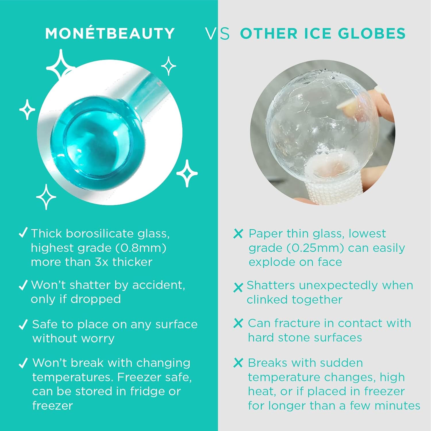- Made with premium glass and non-toxic antifreeze liquid. Unlike other brands, MonetBeauty Ice Globes for facials are safe to store in the freezer, we use only high-end durable borosilicate glass to minimize likelihood of glass breakage.