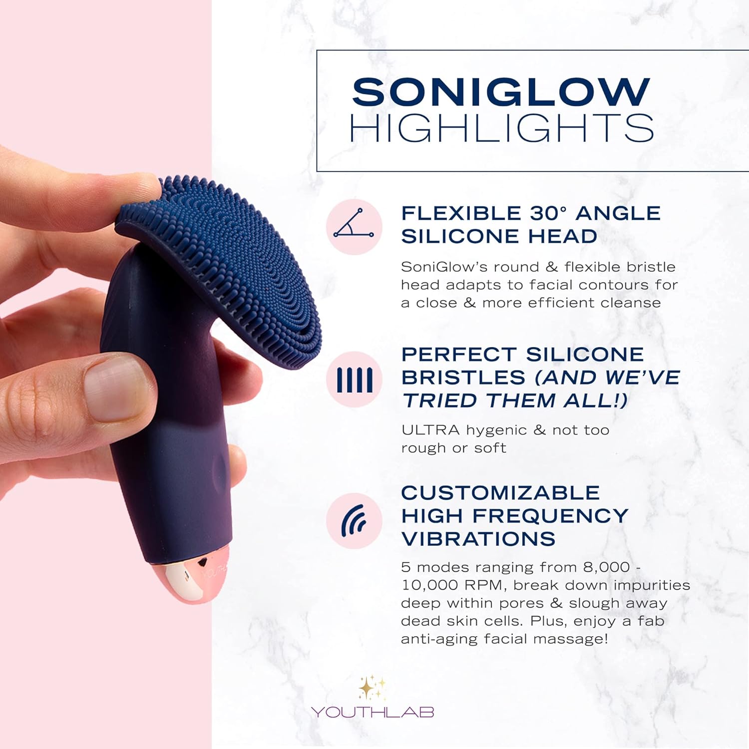 - FLEXIBLE 30° ANGLE SILICONE HEAD: SoniGlow’s round & flexible bristle head, with large surface area, adapts to facial contours for a close & more efficient cleanse.