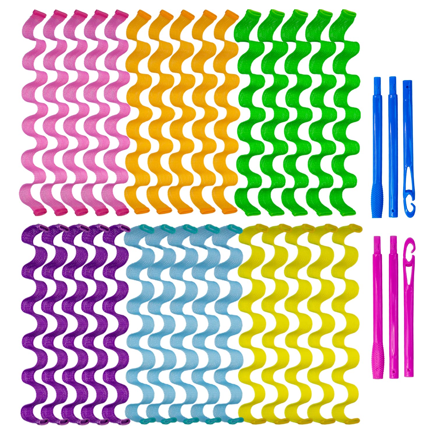 - Package includes: 30pcs wave style hair curlers.pink orange blue green yellow and purple color, 2 sets of hair hooks (blue + pink).