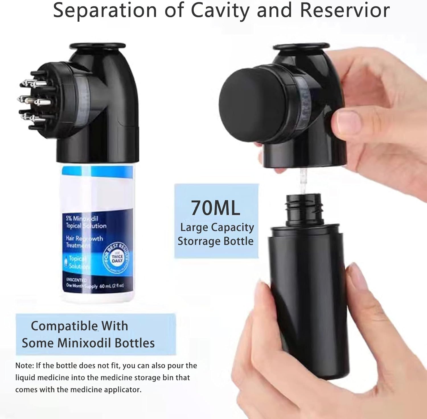 • Flexible Handheld Design: The 70ML large-capacity liquid storage bottle can act as a handle, making it more comfortable to hold and easier to operate. Compatible with some minoxidil bottles. And the liquid tank supports detachable cleaning.
