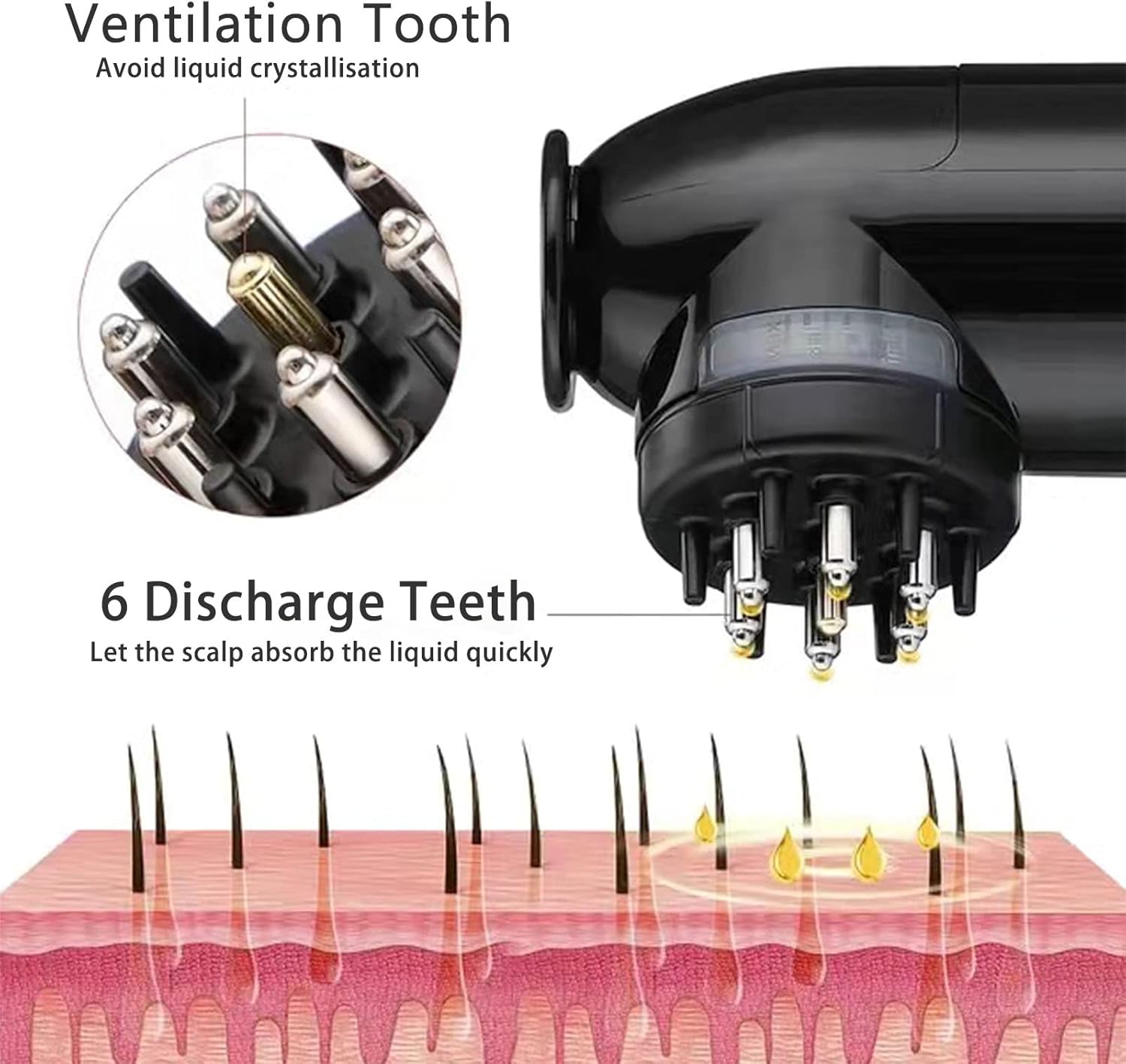 • 6 Discharge Teeth and 1 Ventilation Comb Tooth: Massage the scalp while smearing the liquid evenly, with 1 ventilation tooth avoiding liquid crystallization and the six silicone assisted comb teeth, so that the scalp can absorb the liquid better and more quickly, effectively soothing the scalp.