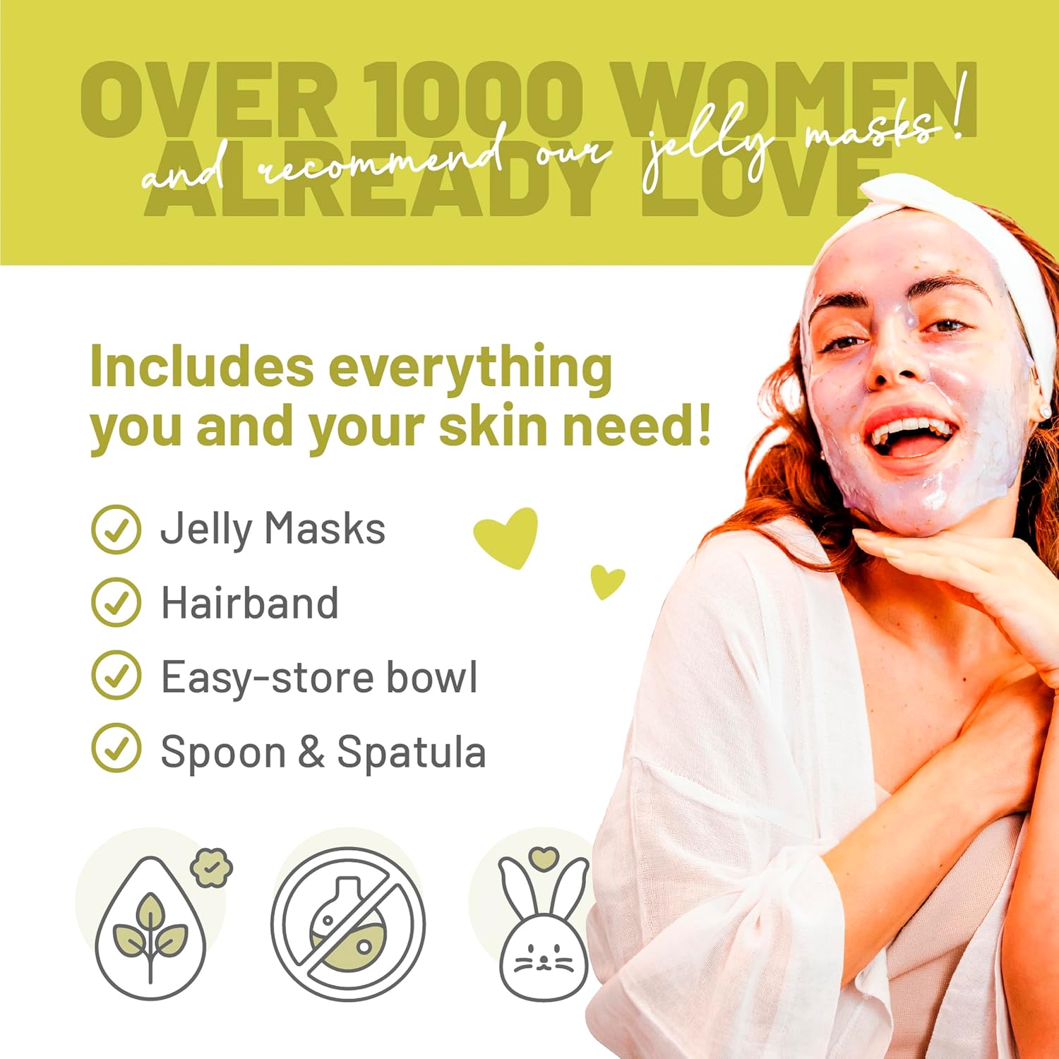 - FULL BODY: We provide premium formulated Jelly Mask that is efficient not only for face care but also an excellent choice for any part of your skin including legs, armpits, and vajacial etc. Note: Bowl, spatula, and hair band accessory included in the box are uniquely colored with each unit.