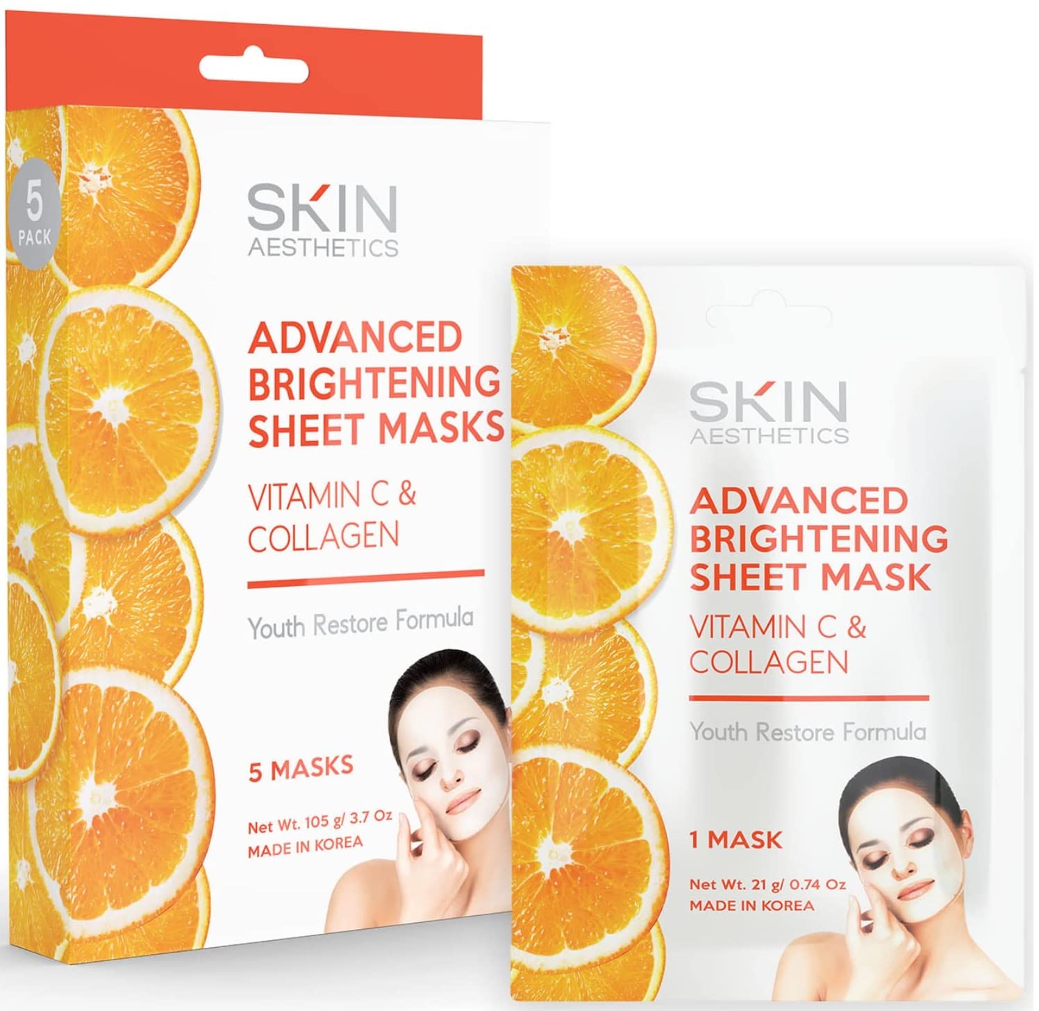Vitamin C & Collagen Sheet Face Mask - Reduces Wrinkles & Age Spots, Hydrating - Dermatologist Tested Korean Skincare - Clean Beauty, Cruelty-Free - 5 Masks