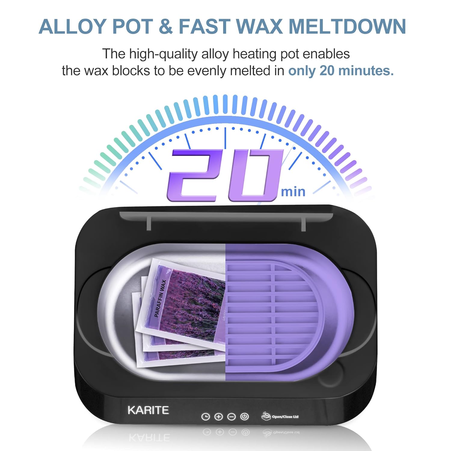 - INNOVATIVE AUTO OPEN LID DESIGN – Unlike ordinary paraffin baths with hand operated lids, KARITE paraffin wax machine is developed with an auto lid that opens when the wax is melted and reached the desired temperature to reduce the cooling time, allowing you to enjoy your relaxing paraffin treatment without prolonged waiting.
