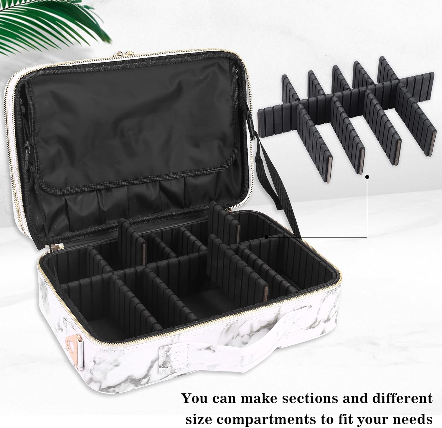 - Portable Design: This makeup organizer is great for make-up items. 1. You can choose whether you want to carry it by the handle, by the shoulder strap, or with the opening on the back for your luggage. 2. The removable divider allows you to choose the desired size or area. It keeps things organized and simple.