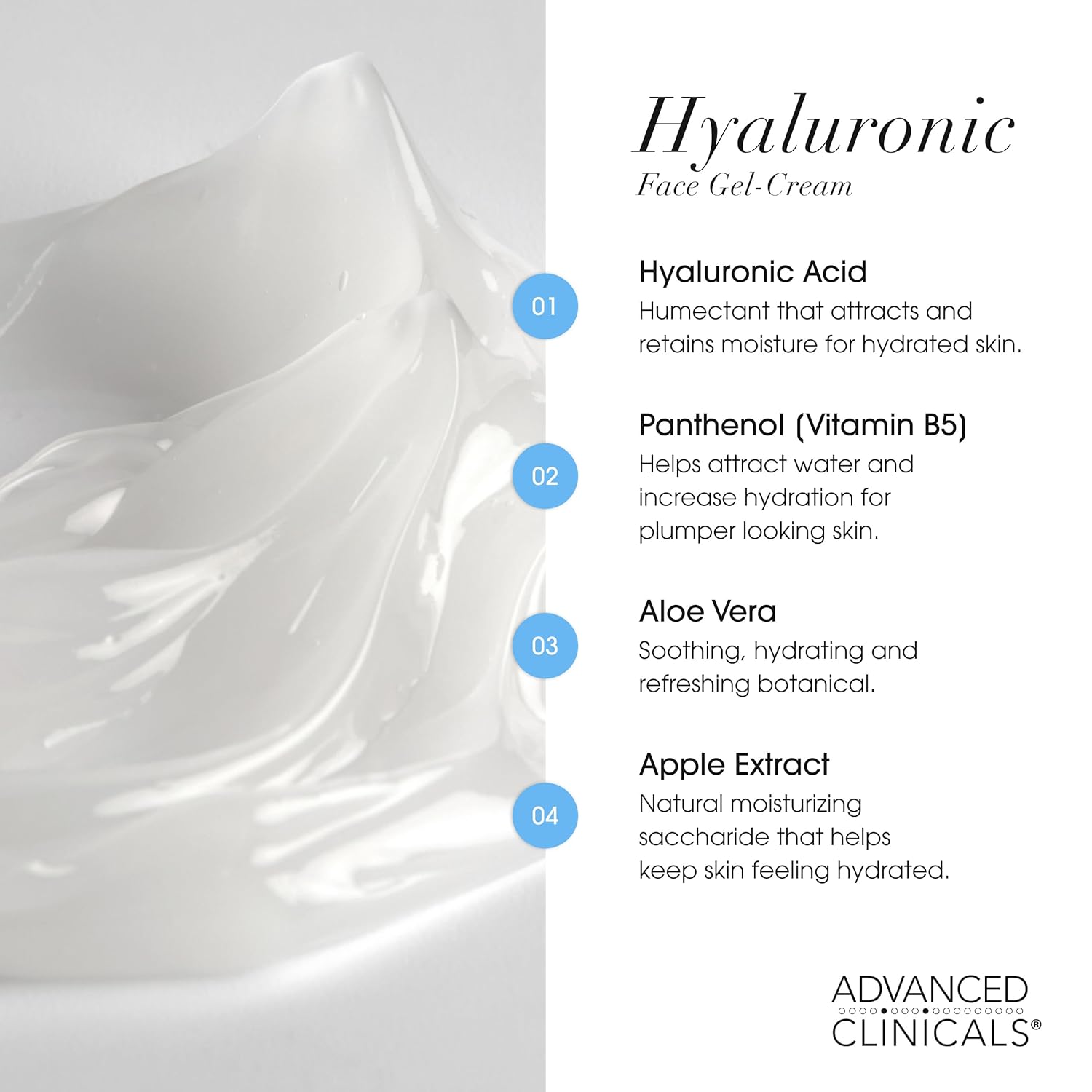 - HYALURONIC ACID MOISTURIZER WITH PANTHENOL (VITAMIN B5), ALOE VERA, & APPLE EXTRACT - Visibly replenishes hydration, softens texture, and reduces the appearance of lines. Skin feels refreshed and dewy.