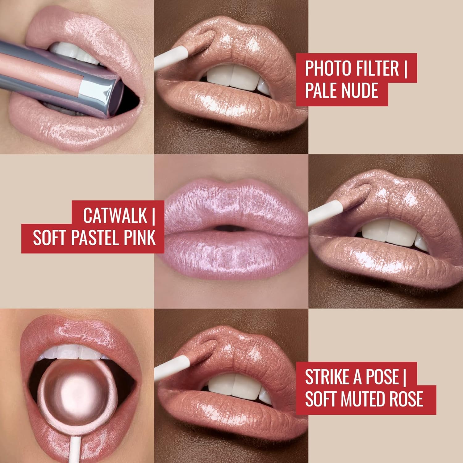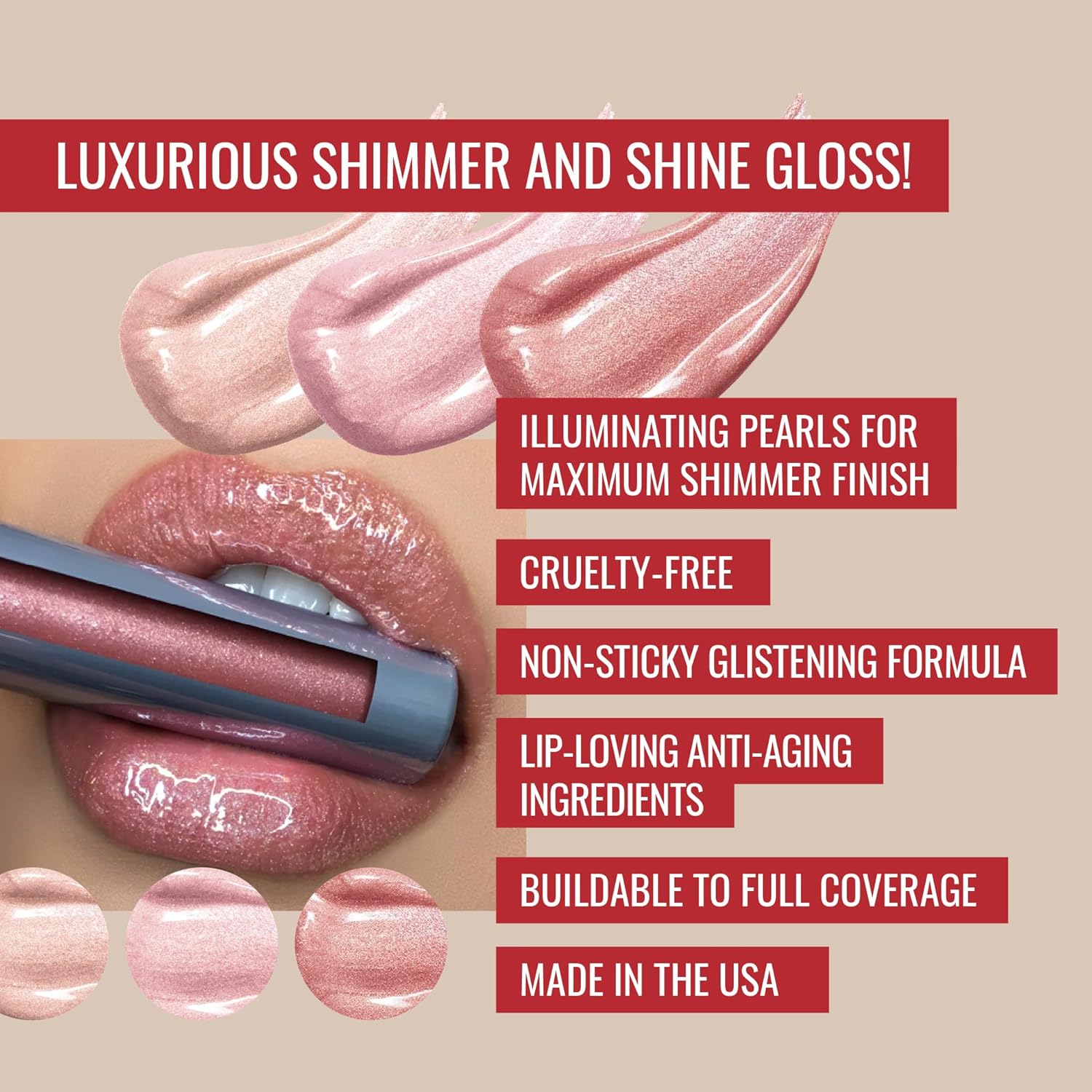 - HIGH-PIGMENT SHIMMER LIP GLOSS: LuxGloss is a creamy high-pigment shimmery lip gloss that delivers a shine that transitions into a gorgeous shimmer with a non-sticky finish and a vanilla bean scent. Our pale-nude ‘Photo Filter’, pastel-pink ‘Catwalk’, and rose-pink ‘Strike a Pose’ lip colors give you a glamorous selection to swipe on and suit any mood.