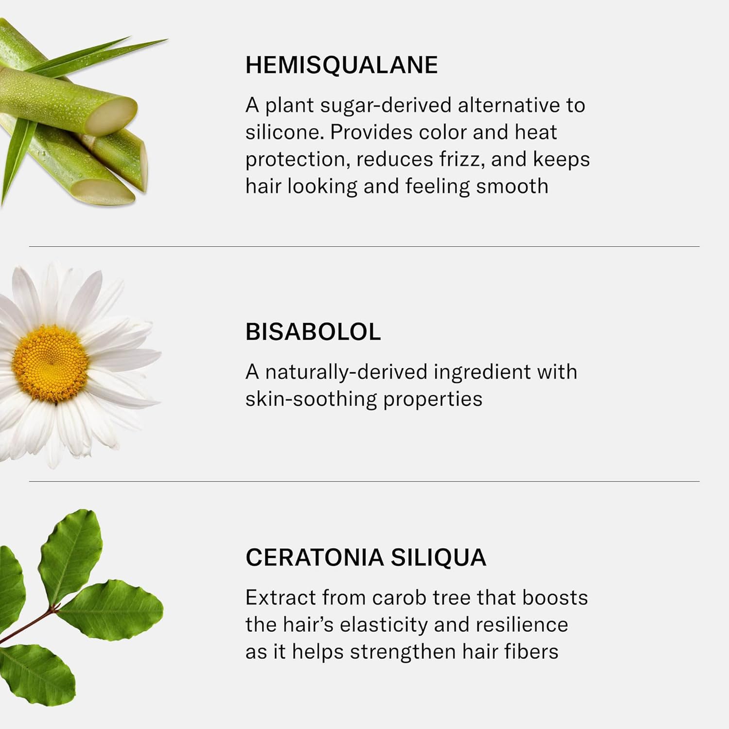 - Hero Ingredients: Hemisqualane – A plant sugar-derived silicone alternative that protects against color fading and heat, reduces frizz, and smooths hair. Bisabolol – A naturally derived ingredient with soothing benefits. Ceratonia Siliqua – Carob tree extract that boosts elasticity and strengthens hair. Moringa Oleifera – Horseradish tree extract that shields hair from pollution and UV rays. Squalane – A plant-based moisturizer that nourishes, restores shine, and adds softness.