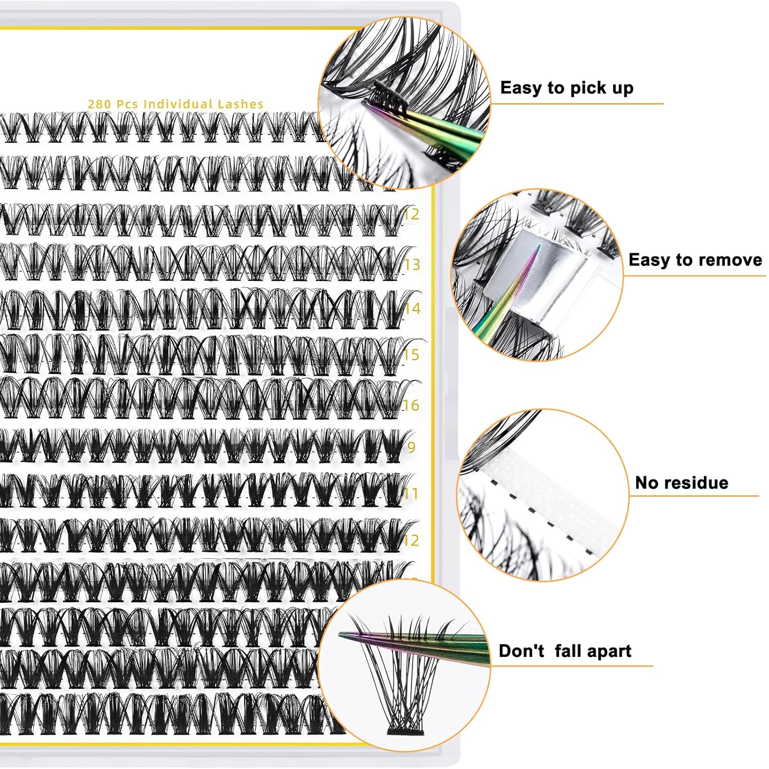 - DIY Individual Clusters at Home: 280 clusters in one tray. You can apply cluster lashes at home by yourself. Easy to put lashes on, gorgeous results, and lash clusters are not easily fall apart. Cluters take less time to complete each eye. Now save so much money and time.