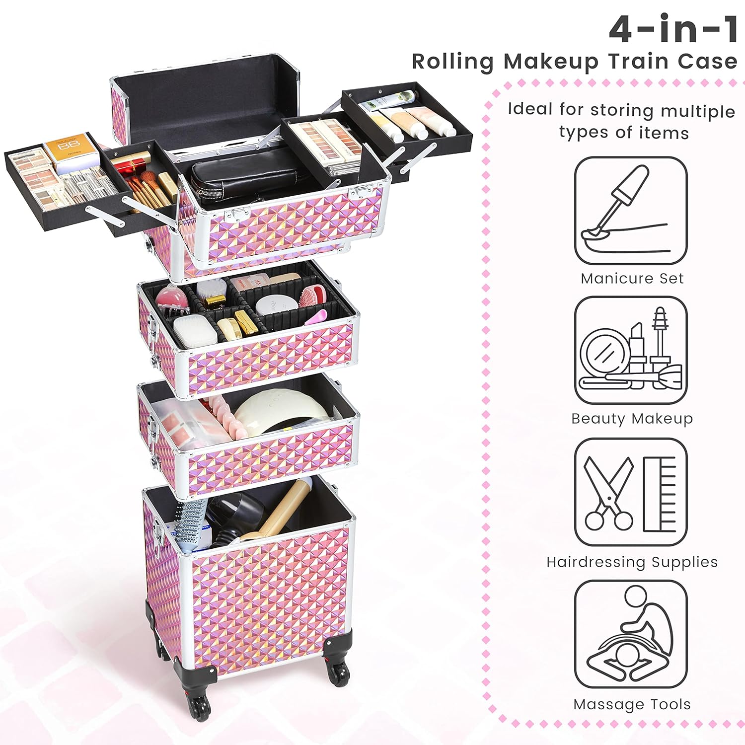 • 4-in-1 Transformable Design: This versatile makeup case features four detachable compartments that adapt to your needs. The top compartment is ideal for essentials, while the middle drawers can be removed to configure a 3-in-1 or 2-in-1 case, depending on your requirements