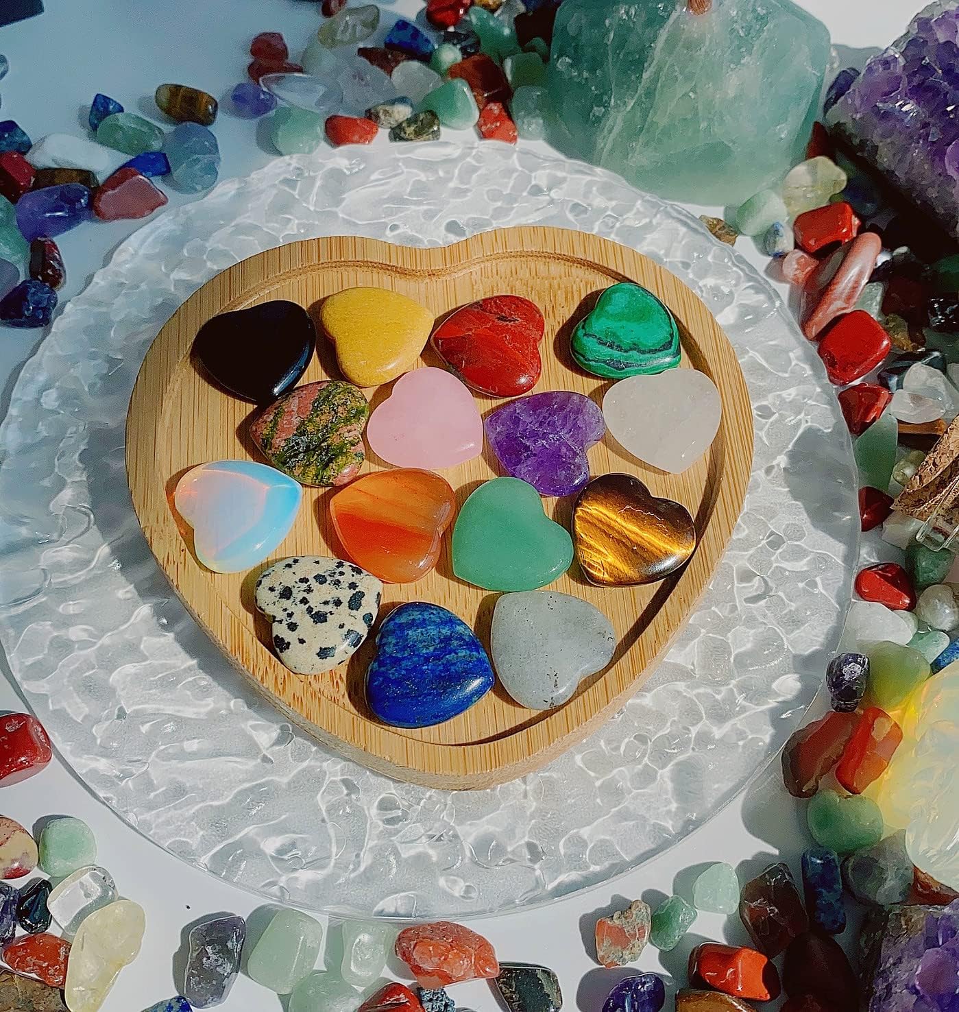 - 【 Basic Information 】 Specification attributes : 15 PCS Set Mini Heart Shaped Crystal -- Rose Quartz, Clear Crystal, Unakite, Tigers Eye, Green Aventurine, Black Obsidian, Red Carnelian, Yellow Aventurine, Amethyst, Lapis lazuli, Red Jasper, Opalite, Grey Labradorite, Dalmatian Jasper, Malachite. (appro.)Size : 0.8*0.8*0.24 ". Convenient to put in your pocket and hold in your hand to conduct energy guidance. It is suitable as a gift for crystal lovers, crystal beginners, craft lovers.