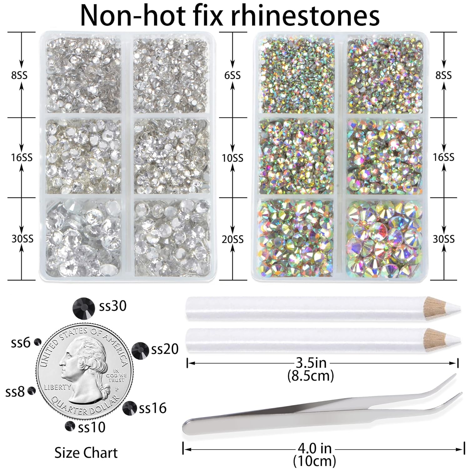 - Approx 6000 pcs of good quality sparkly flatback glass rhinestones with tweezers and 2 picker wax pencils help you easily pick up and set rhinestones in all your jewelry.