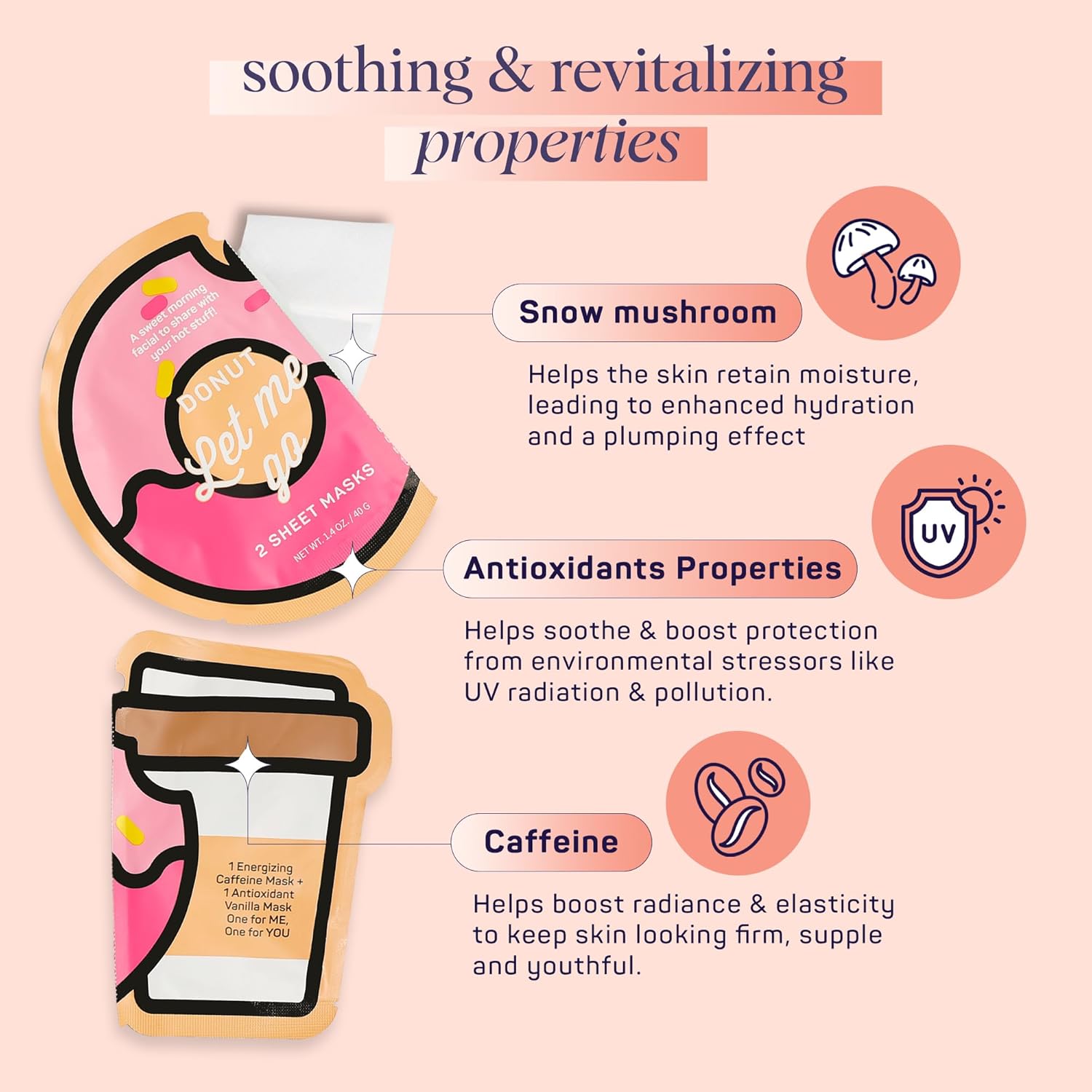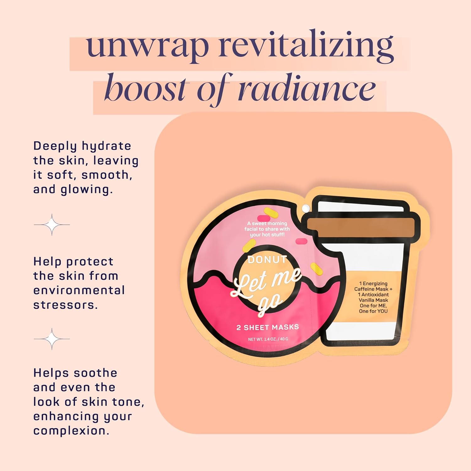 - HYDRATING DUO FOR VIBRANT SKIN: A dynamic duo designed for ultimate hydration. Featuring Radiant caffeine and soothing vanilla-scented masks, this set ensures a soft and glowing skin.