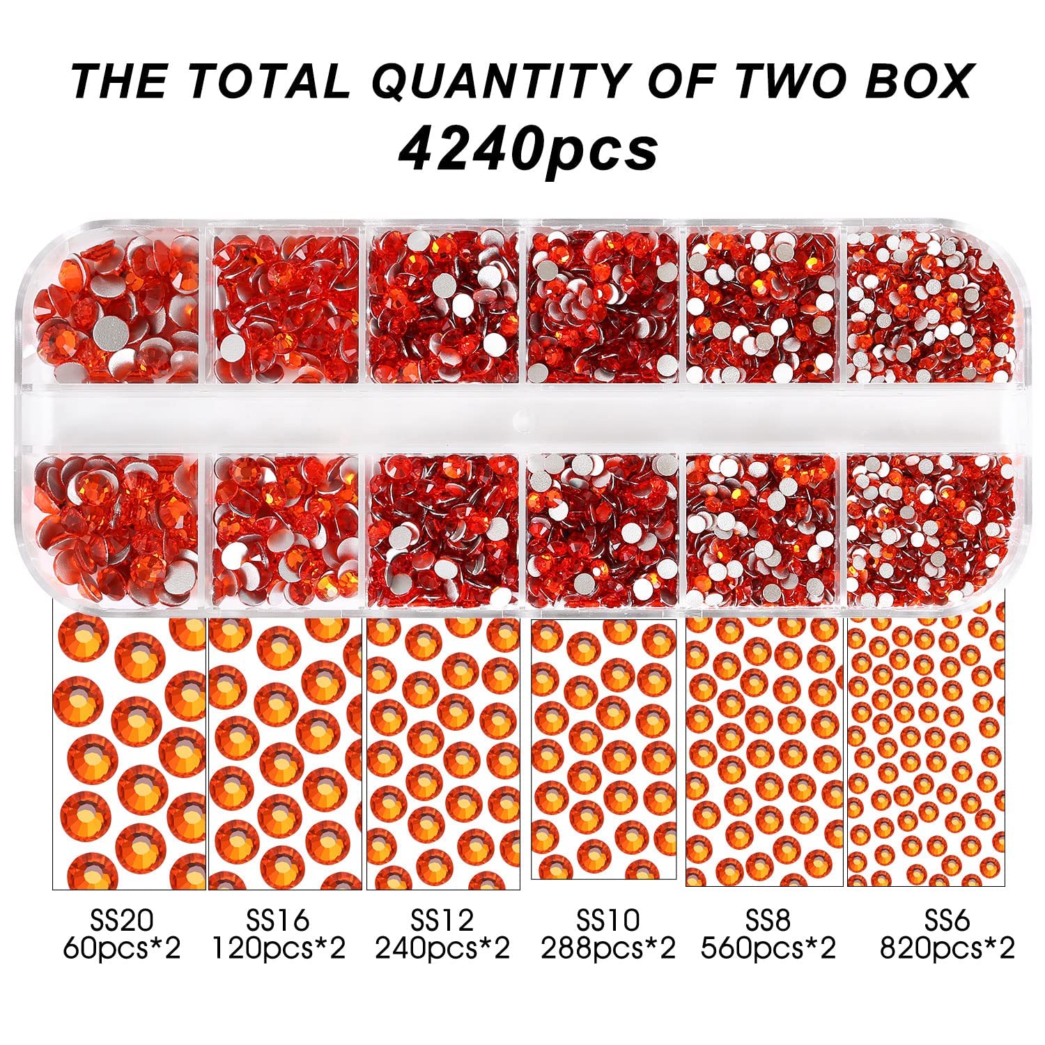 4240Pcs Orange Flatback Rhinestones 6 Sizes Crystal Diamonds for Nail Art Crafts Clothes Shoes with Tweezers and Picking Pen