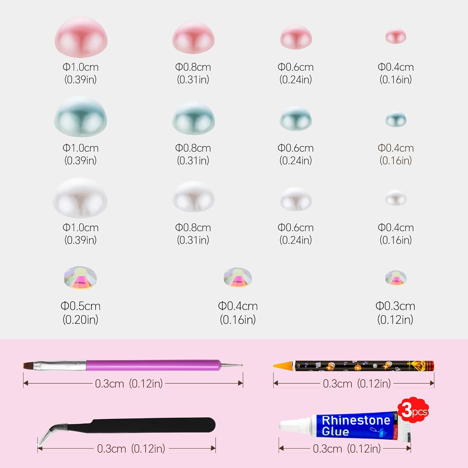 - What You Will Receive: 60g(30g*2)mixed size flat back pearls and rhinestones. 3*Rhinestone Glue. 1* wax pencil for rhinestones. 1*Pencil sharpener(color random). The mix half round pearls and rhinestones can make more beautiful handicrafts for your friends, parents, yourselfs on any festivals.If you need a mixed size pack of pearl rhinestones