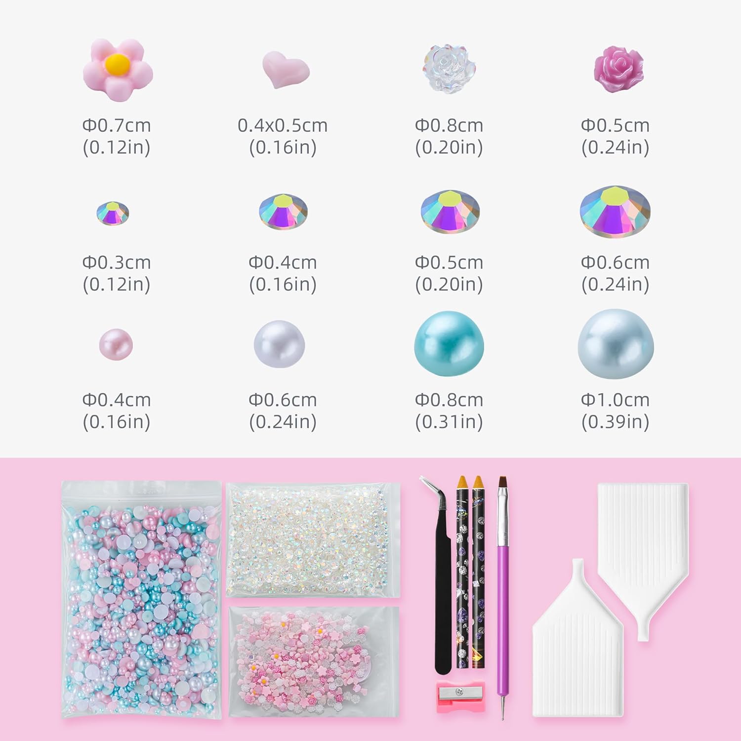 - What You Will Receive: 60g(30g*2)mixed size flat back pearls and rhinestones. 3*Rhinestone Glue. 1* wax pencil for rhinestones. 1*Pencil sharpener(color random). The mix half round pearls and rhinestones can make more beautiful handicrafts for your friends, parents, yourselfs on any festivals.If you need a mixed size pack of pearl rhinestones