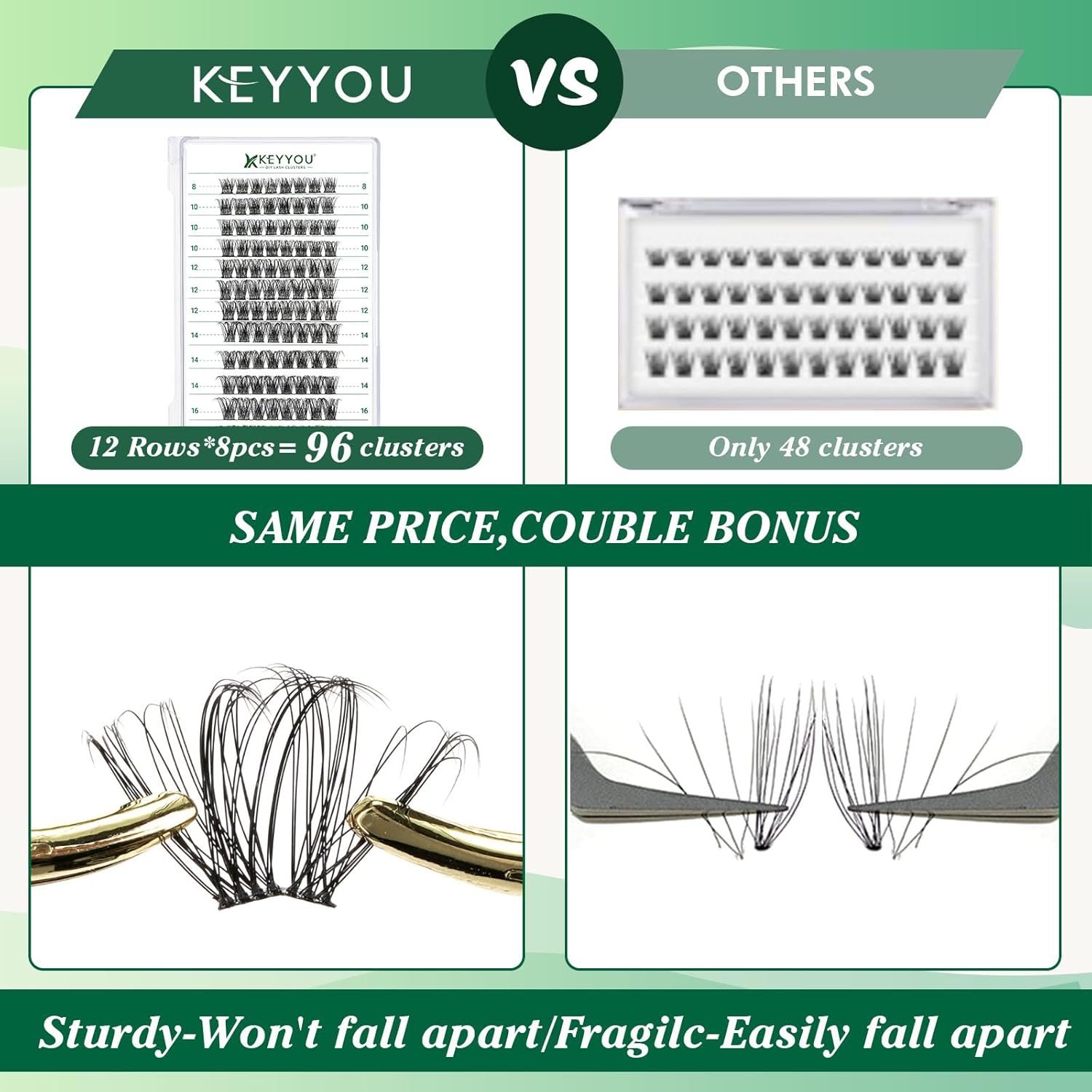 - 【Soft&Comfortable】KEYYOU lash cluster are made of imported materials,the stem line is thinner and softer, the eyelash cluster are lighter and more comfortable to wear.96 clusters in one tray ,more cost-effective.