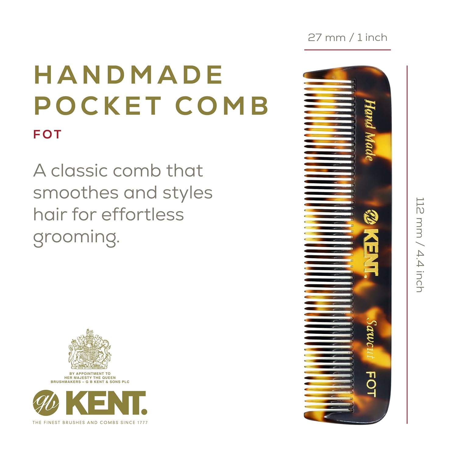 Kent FOT TY Fine Tooth Comb for Men - Handmade Pocket Comb for Travel, Styling, Fine or Thinning Hair, Mustache and Beard Care Handpolished Saw-Cut Made in England