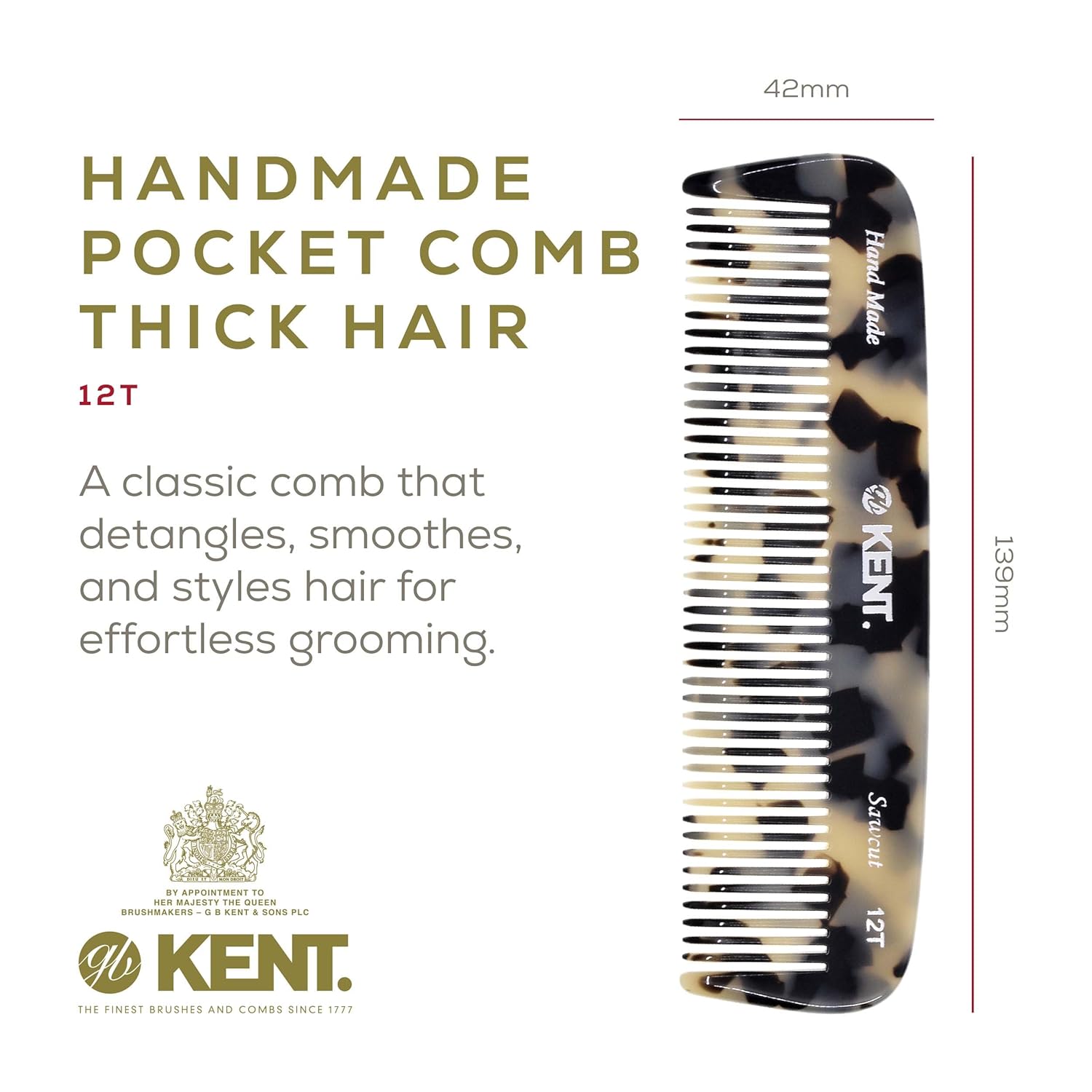 Kent 12T TW Wide Tooth Detangling Comb - Handmade Pocket Comb for Thick, Curly, and Wavy Hair, Grooming Beard and Mustache