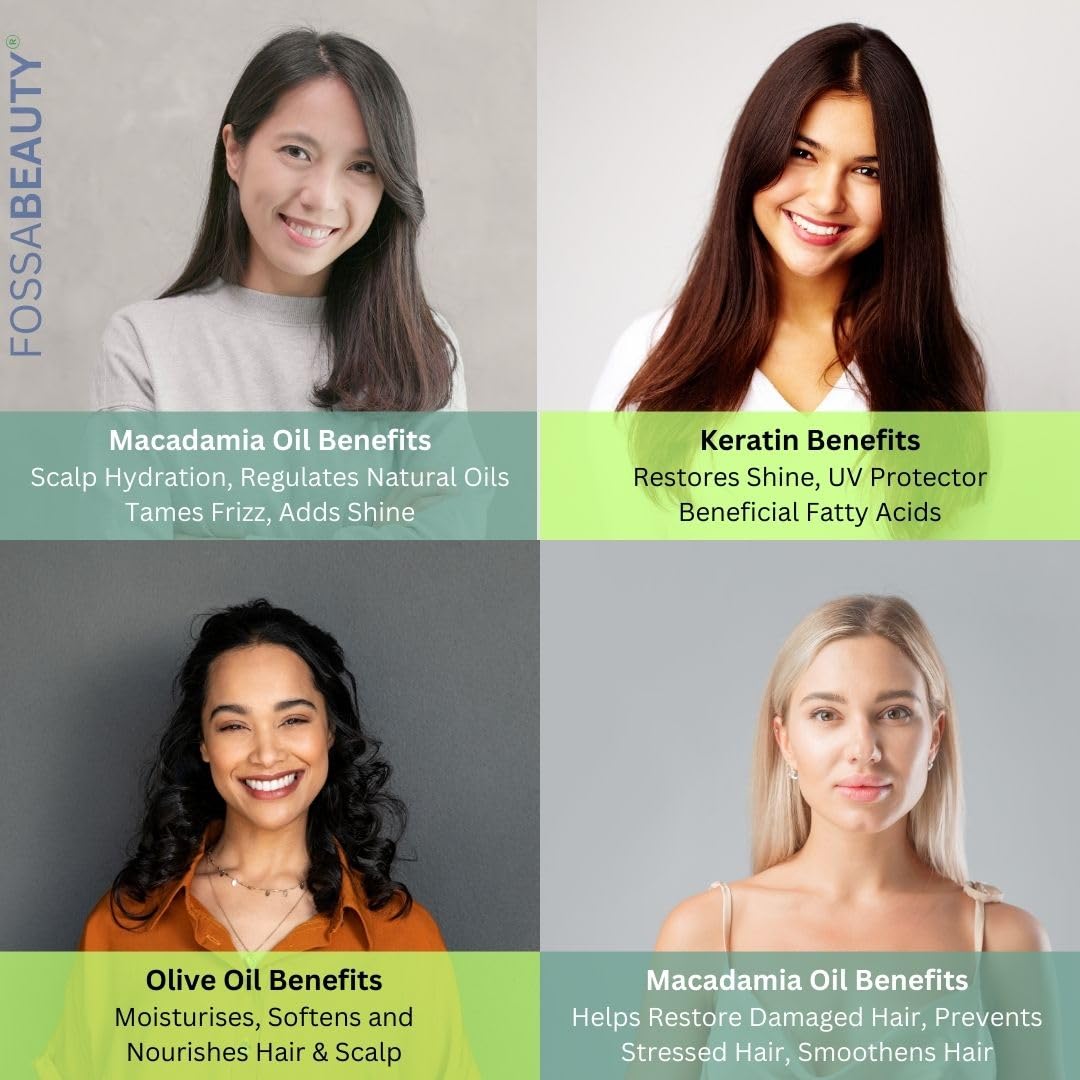 - HAIR REPAIR FOR ALL HAIR TYPES: Fossa's Restorative Macadamia Nut Oil Hair Treatment with Keratin provides healing treatment for all hair types. The macadamia oil can reduce heat damage while boosting shine and moisturizing the scalp as it strengthens and hydrates the hair. The keratin oil blend helps manage frizz as it strengthens and repairs the structure of the hair shaft and damage caused by heat. Combined, the infusion of the two oils can help every hair type have manageable and smooth looking hair.