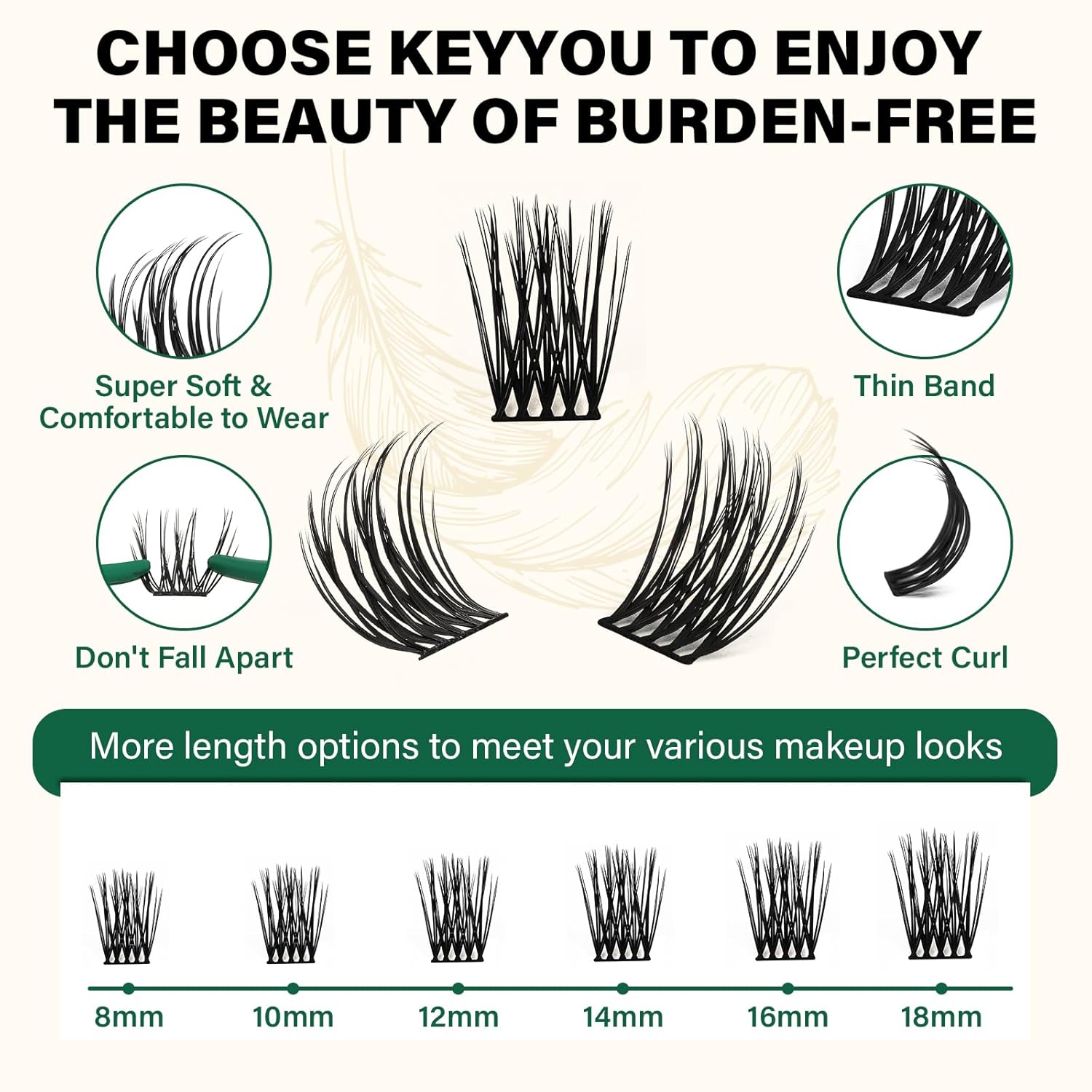 - HIGH QUALITY:KEYYOU lash clusters also made of high-grade fiber material.They have no plastic feel and very natural to wear,don‘t harm the eyes.