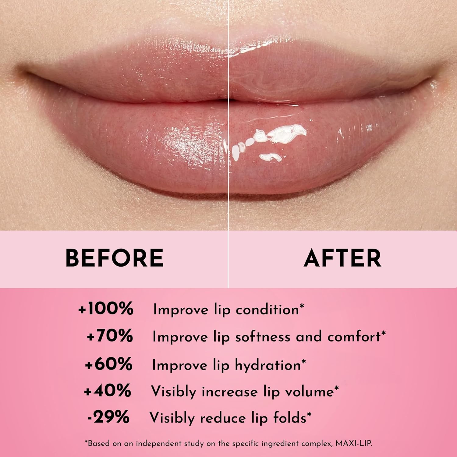 - Key Active Ingredients: Formulated with MAXI-LIP, a natural peptide complex that stimulates collagen synthesis via Hyaluronic Acid. Our gloss deeply moisturizes and firms the lips, making them appear bigger, smoother, and more defined. Enriched with Shea Butter to hydrate and soothe the lips, and Rosehip Oil to make them pillowy soft.