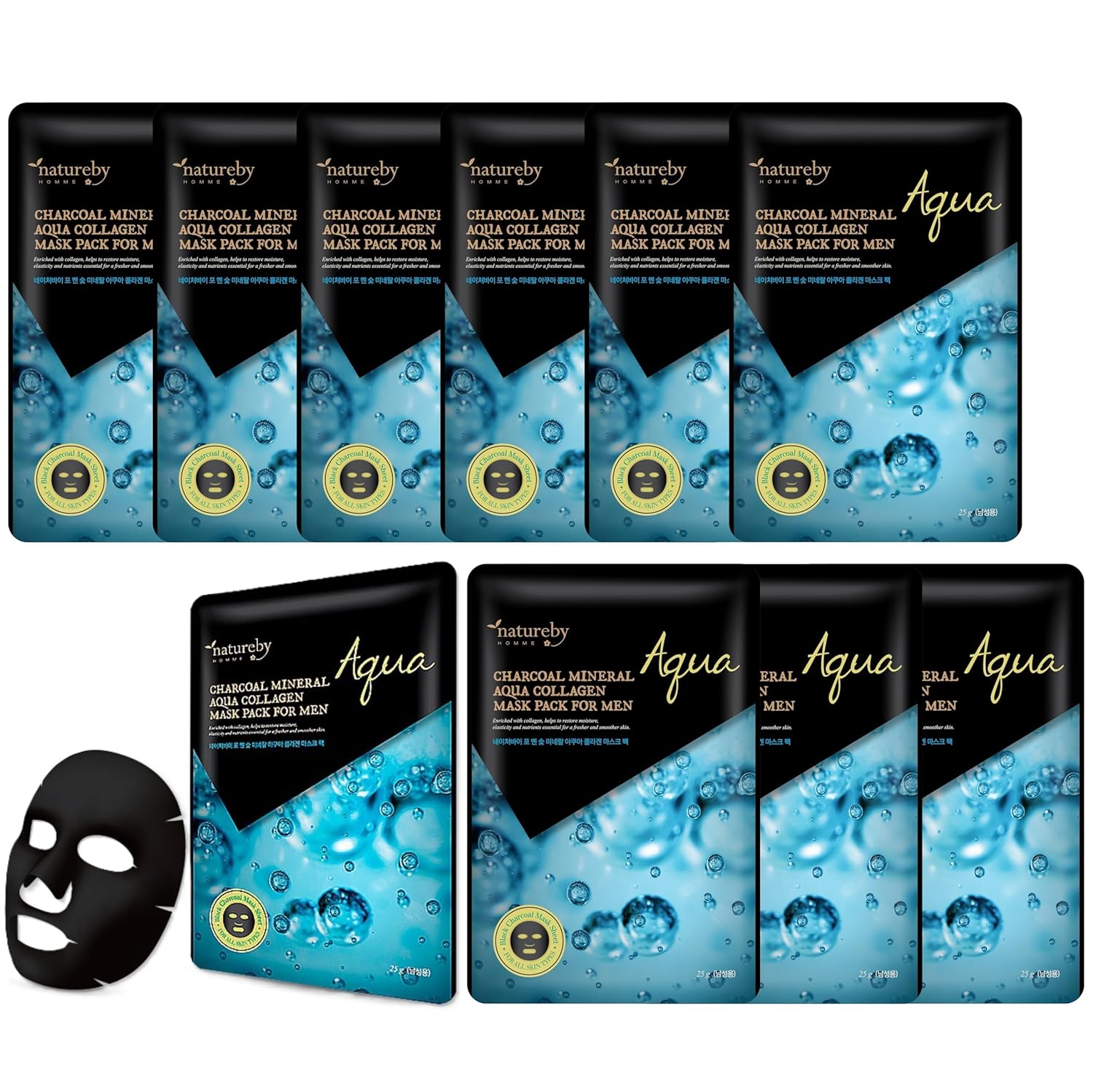 Charcoal Mineral Mask Pack for Men, Korean Skincare Face Wrinkle Treatmen Mask Sheets, Men's Skin Care Sets, Travel Essentials & Gift Sets for Men (Aqua Collagen, Pack of 10pcs)