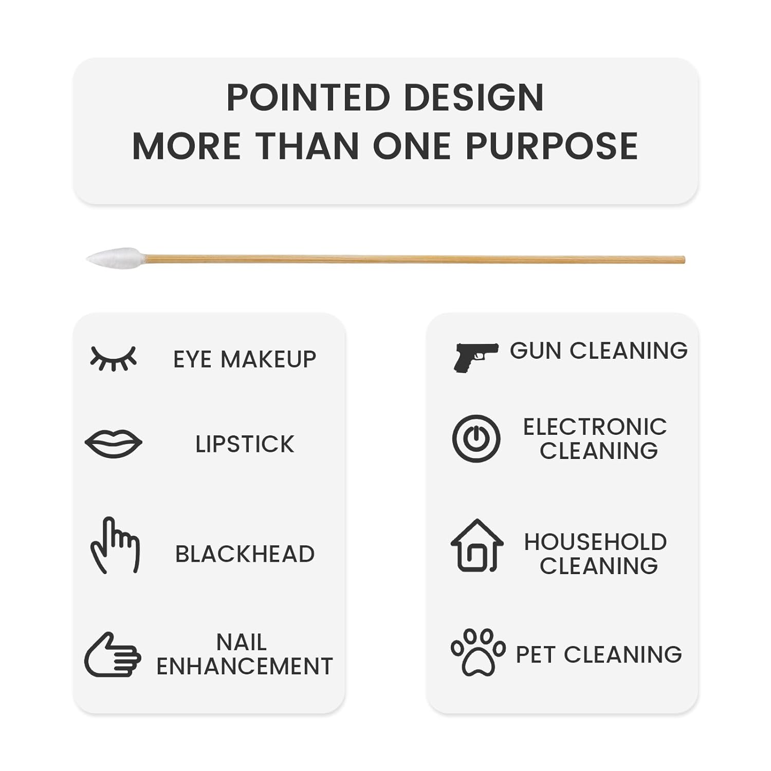 - [Pointed-Tips] Precision large cotton swabs are made of healthy natural cotton. The cotton swabs pointed tip ends get into any little crease or crevice, make gun cleaning easy