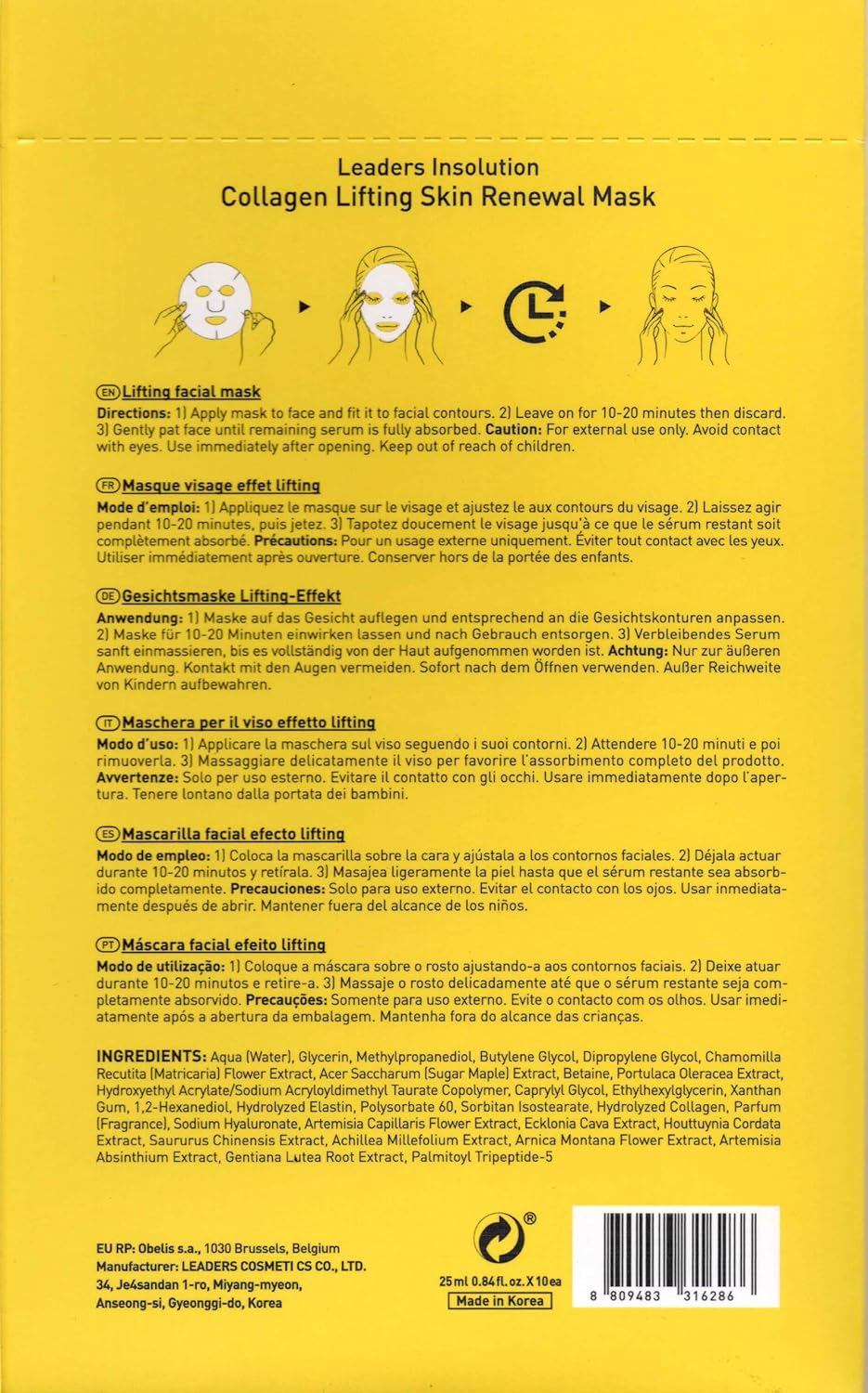 - LEADERS QUALITY ASSURANCE – Manufactured in South Korea by Leaders, a renowned skincare brand with its own R&D center and production facilities, each product undergoes rigorous testing to ensure the highest quality and effectiveness. Leaders Insolution Collagen Lifting Masks are easy to use: Cleanse and prep skin with toner. Remove mask from the pouch and fit to facial contours. Leave on for 10-20 minutes for optimal results. Gently massage extra serum into face and neck until fully absorbed.