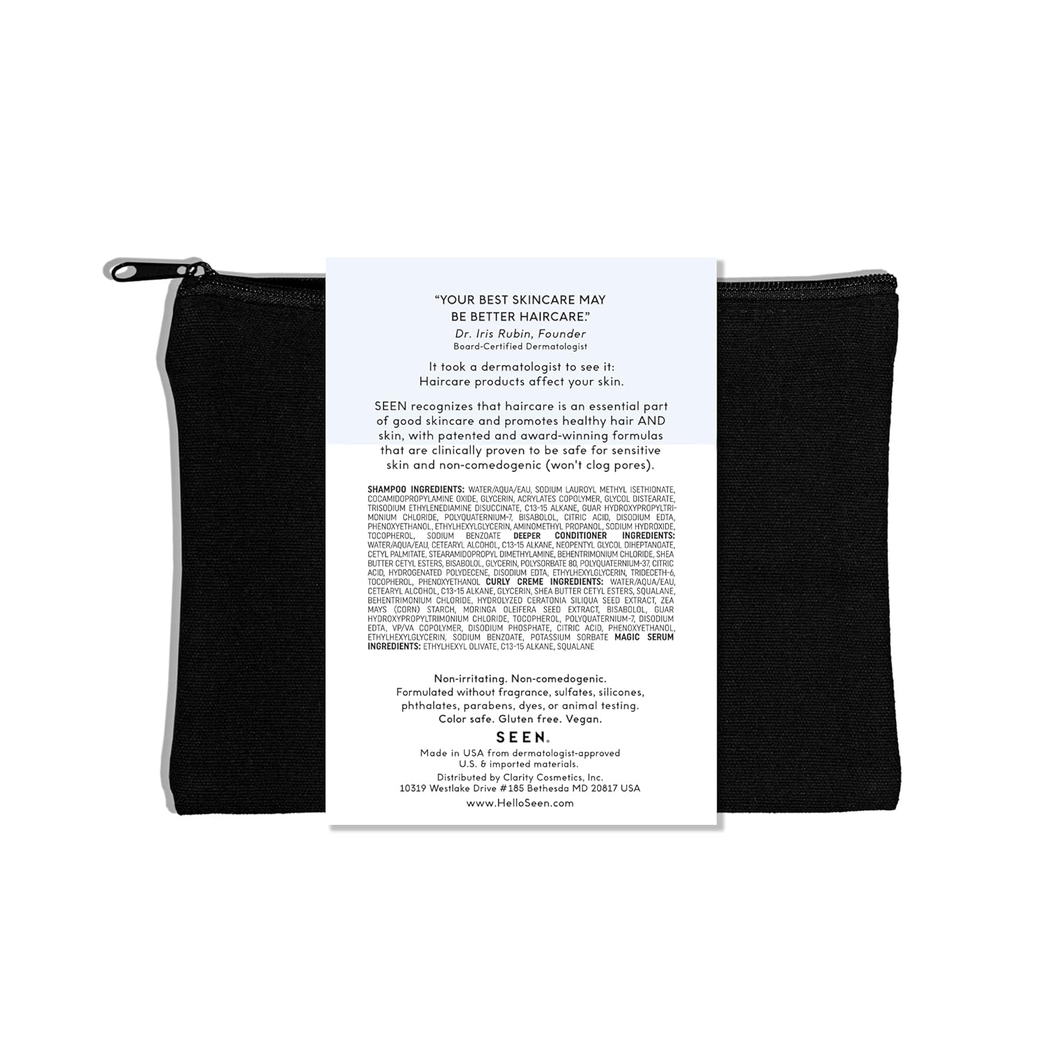 - A dermatologist-developed, fragrance-free, vegan, non-comedogenic set for curly hair that features travel-friendly sizes of SEEN Shampoo, Deeper Conditioner, Curly Creme and Magic Serum.