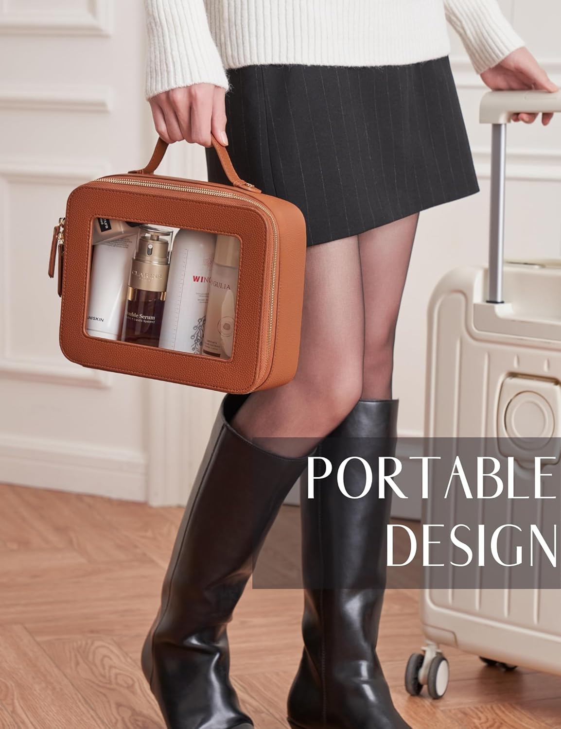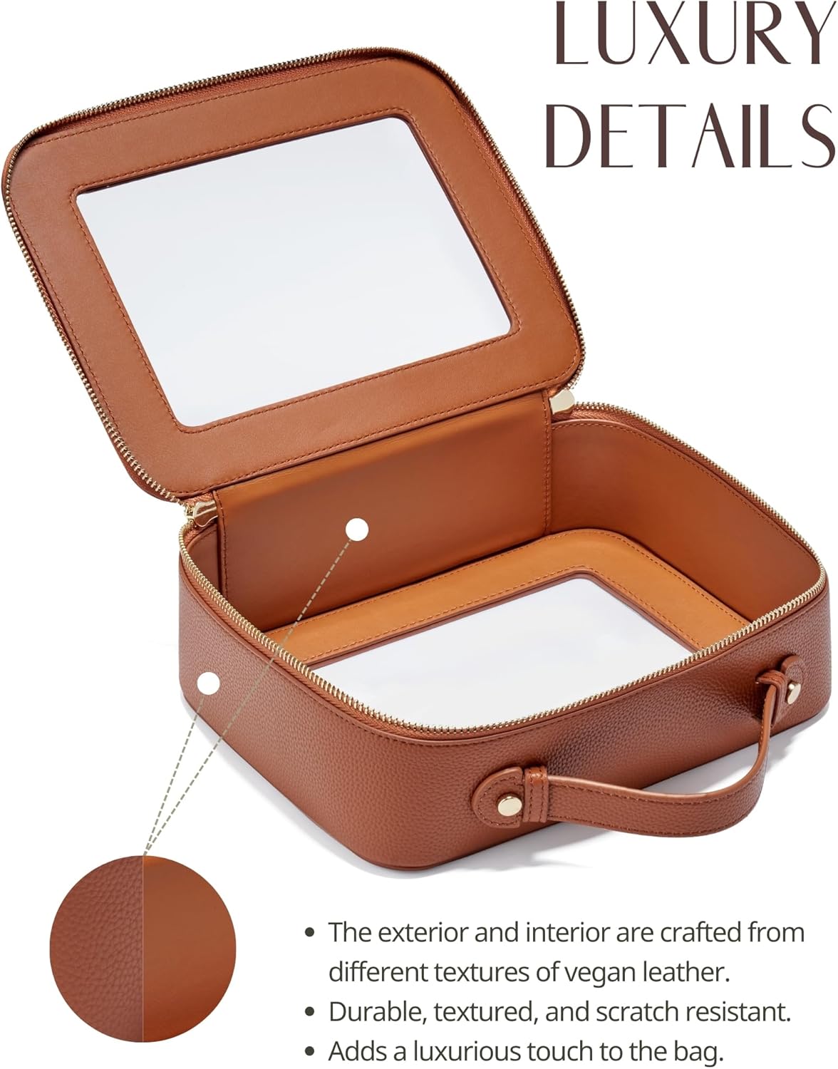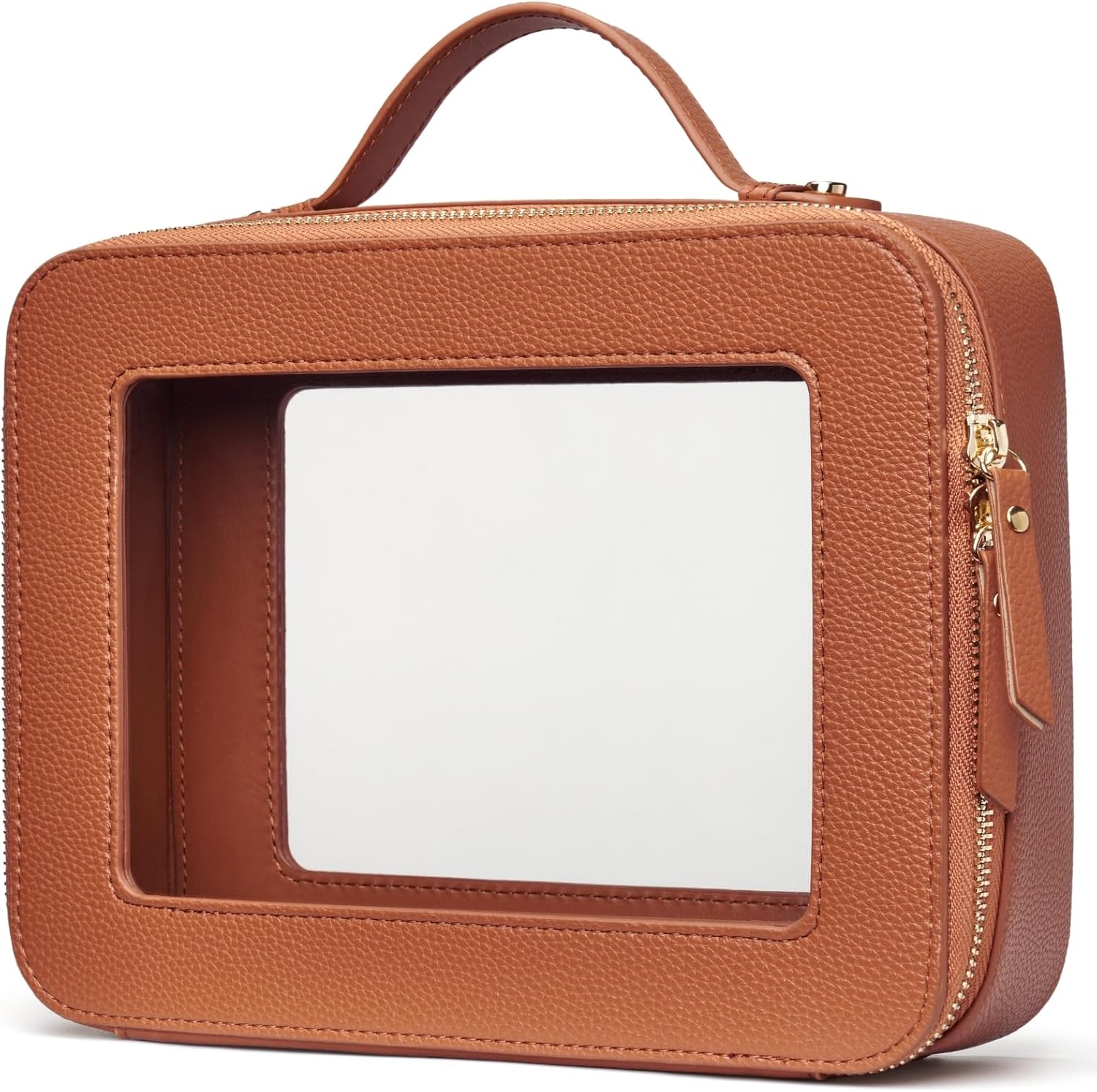 • [Premium Material and Durability] – The clear cosmetic case, both the exterior and interior, is crafted from high-grade faux leather, which is highly scratch resistant, durable and exceptionally easy to keep clean. It features a smooth zipper for secure closure, and elegant light gold metal hardware accents, adding a luxurious and sophisticated touch to the bag's overall design.