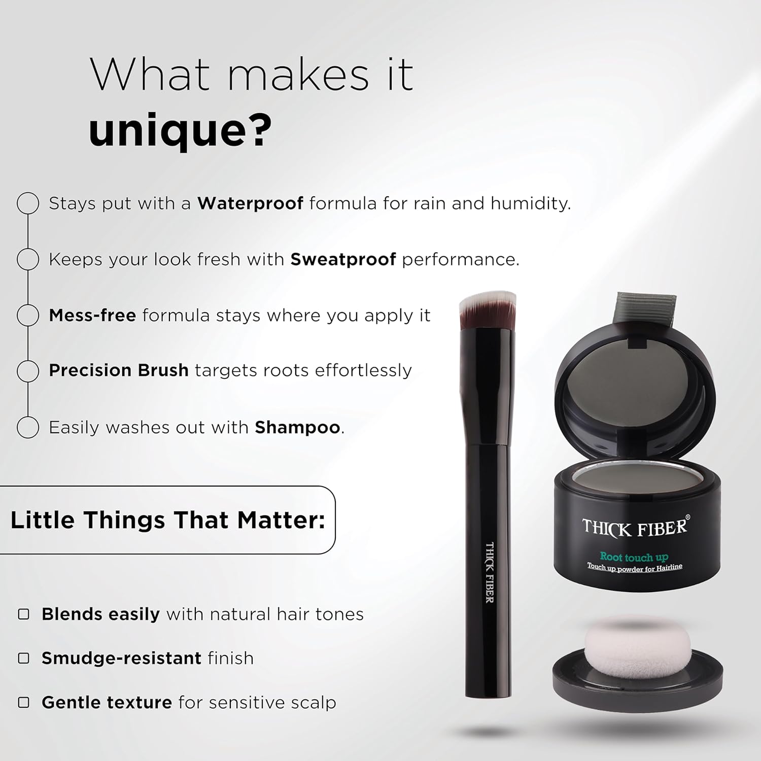 - INSTANTLY CONCEALS THIN HAIRLINE AND COVERS GRAY ROOTS: The THICK FIBER Root Touch Up Powder is your secret weapon for effortlessly concealing thin hairlines and those unwelcome gray roots. With a few quick strokes, watch as the hair concealer powder works its magic, providing you with instant coverage that camouflages imperfections and boosts your hairline's fullness.