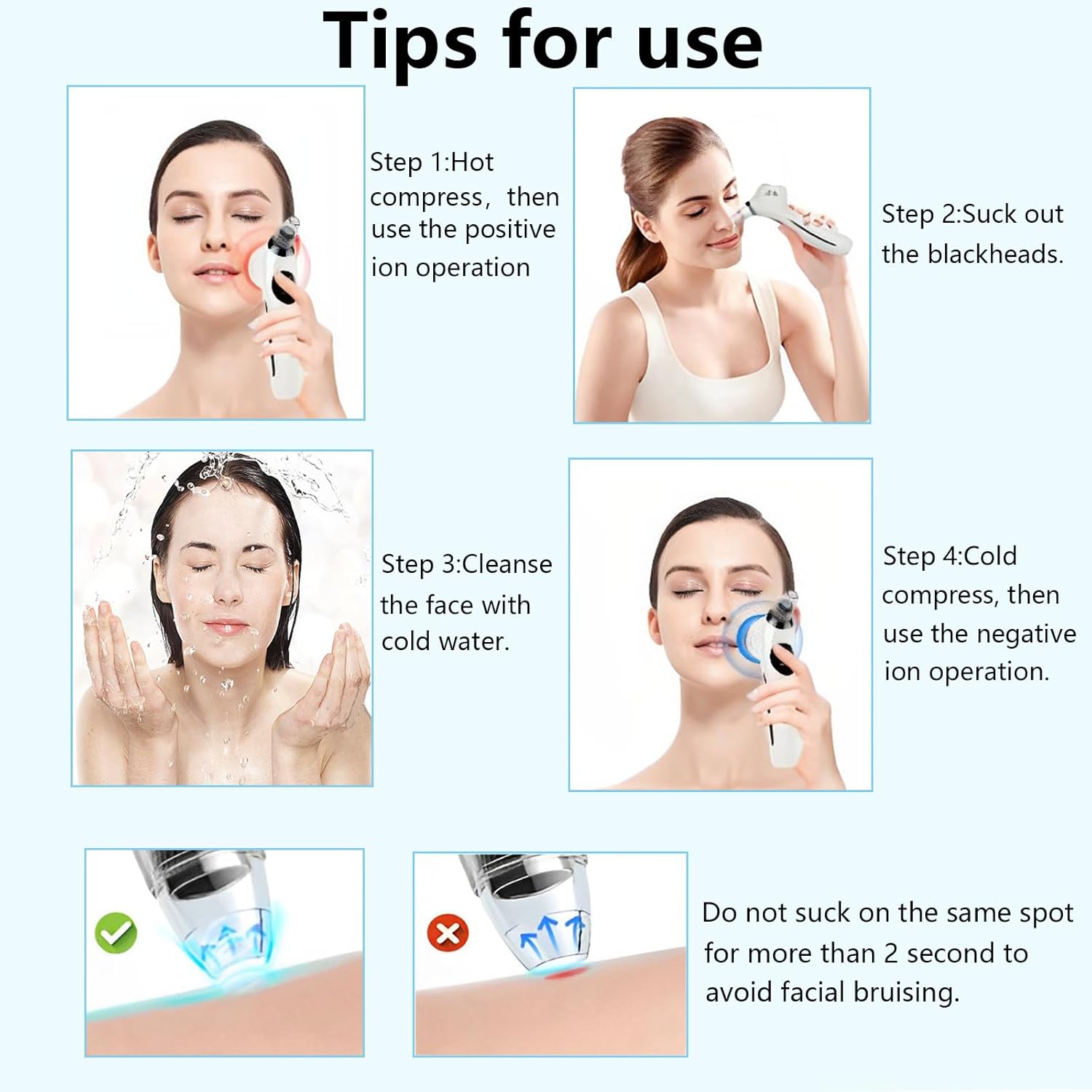 - 【Tips for use】-Here some tips for the blackhead extractor:1.Use hot compress operaton or hot towel to open pores, then apply positive ion operation to derive bottom dirt and blackhead on your face for 3-5 minutes.2.Choose a suitable suction probes and move slowly with a suitable suction power to suck out the blackhead.3.Wash your face with cold water after cleansing.4.Use a cold compress to shrink pore,then use the negative ion operation to deeply mourish your skin.
