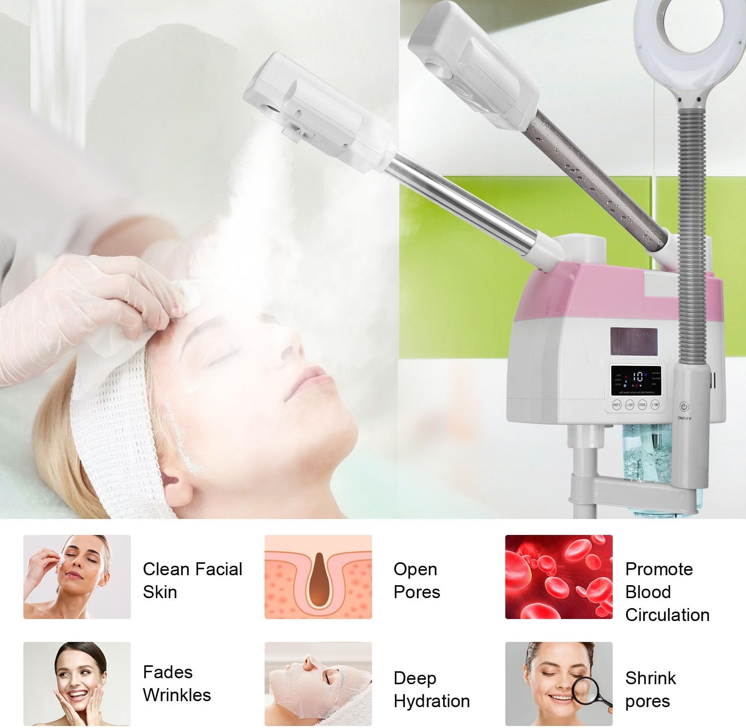 - đă3-in-1 SteamerăDesign of dual nozzle cool/hot mist and 5X Magnifying Lamp, meeting your different needs. The hot mist opens pores and deeply cleanses oil and dirt, while the cold mist tightens pores, locks in moisture, reduces facial wrinkles, and make the skin delicate.