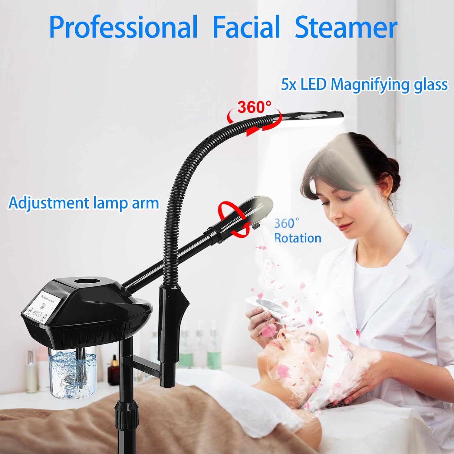 Professional Facial Steamer on Wheels, 2-in-1 Facial Steamers with 5X Magnifying Lamp, Facial Steamer for Facial Deep Cleaning, Facial Humidifier for Spa, Salon and at Home Use
