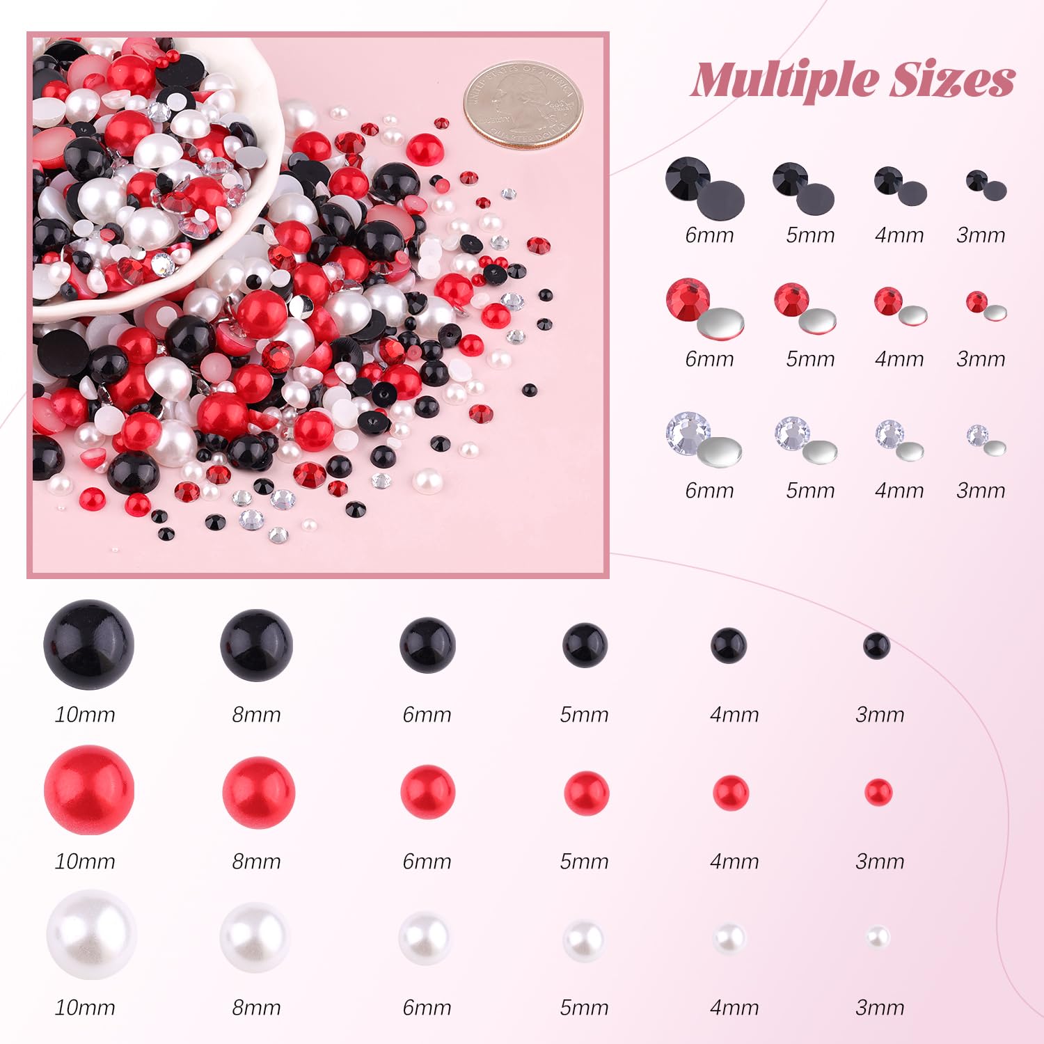 - ✦MIXED SIZE: This set contains six sizes of half pearls (3/4/5/6/8/10mm) and four sizes of round rhinestones (3/4/5/6mm), and each gem comes in 3 different colors. The various size range of pearls and gems can be used for nail art, craft, and decoration.