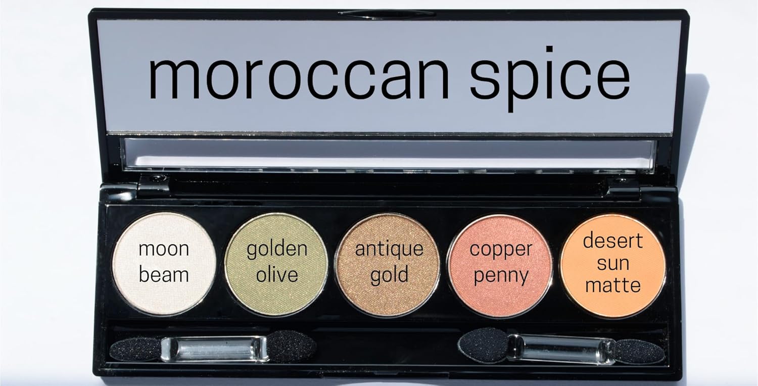 Moroccan Spice Shimmer White, Olive Green, Gold, Copper Penny Red, and Light Matte Orange Vegan Eyeshadow Palette; Talc, Paraben & Cruelty Free
