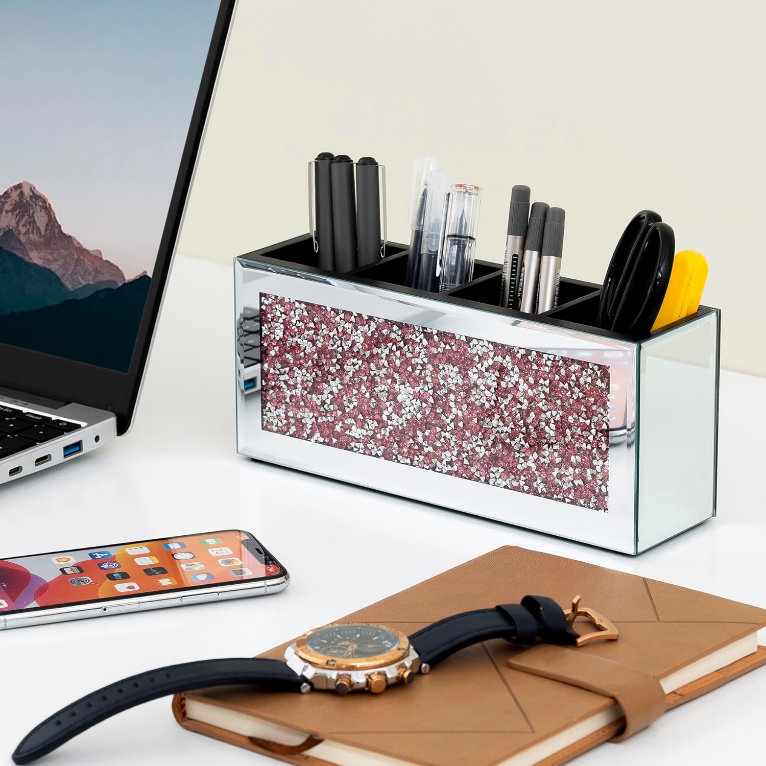 - Durable and Stylish Glass Construction: Unlike typical acrylic holders, this brush holder is crafted from sturdy glass, wood, and crystal, giving it a more luxurious feel and longer-lasting durability. The mirror glass and pink crystal combination enhances its decorative appeal, making it a centerpiece on your vanity.