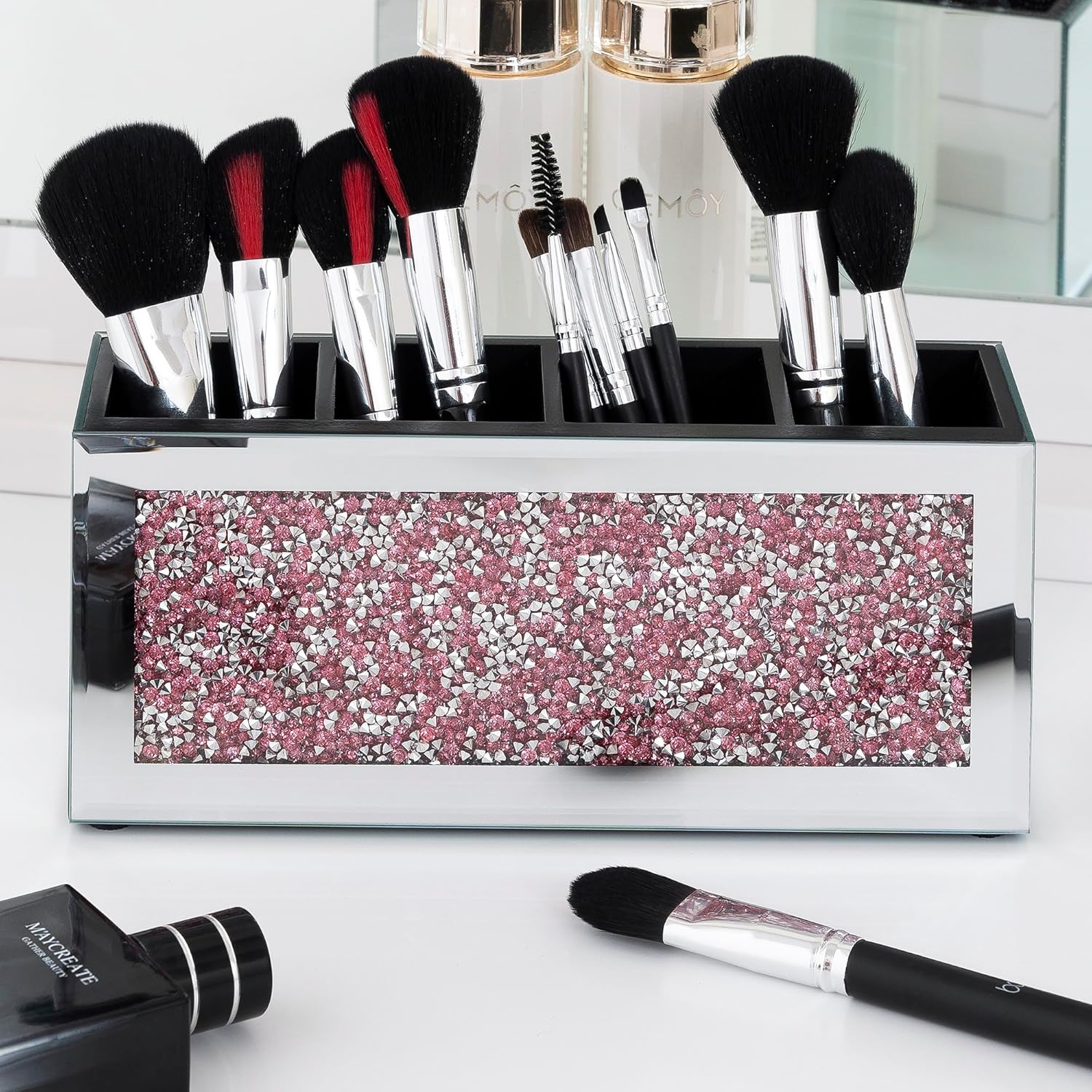 - Chic Pink Design with Crystal Accents: Add a pop of color to your vanity with the SHYFOY Makeup Brush Holder in pink. The mirror glass finish with sparkling pink crystal diamonds on the front creates a sophisticated yet playful look, while the 4-slot design offers ample space for your brushes and tools.
