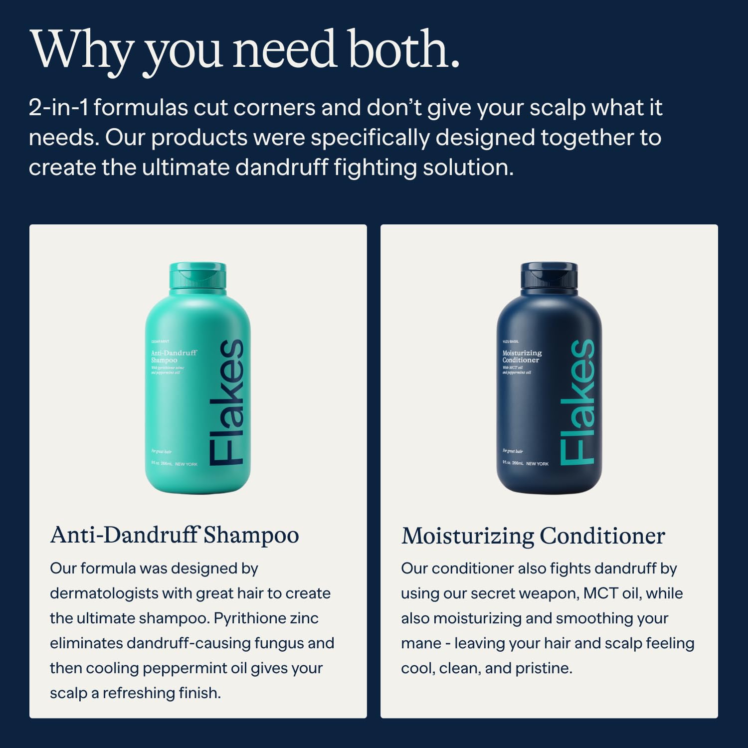 - The One-Two Punch: Our cooling peppermint dandruff shampoo formulated with 2% pyrithione zinc (not the ineffective stuff other brands use) and our moisturizing conditioner with MCT oil that leaves your hair healthy not papery (like with 2-in-1s), are finally together…in separate bottles. Wash with Flakes dandruff shampoo and conditioner set to keep your hair fresh, hydrated, and protected.