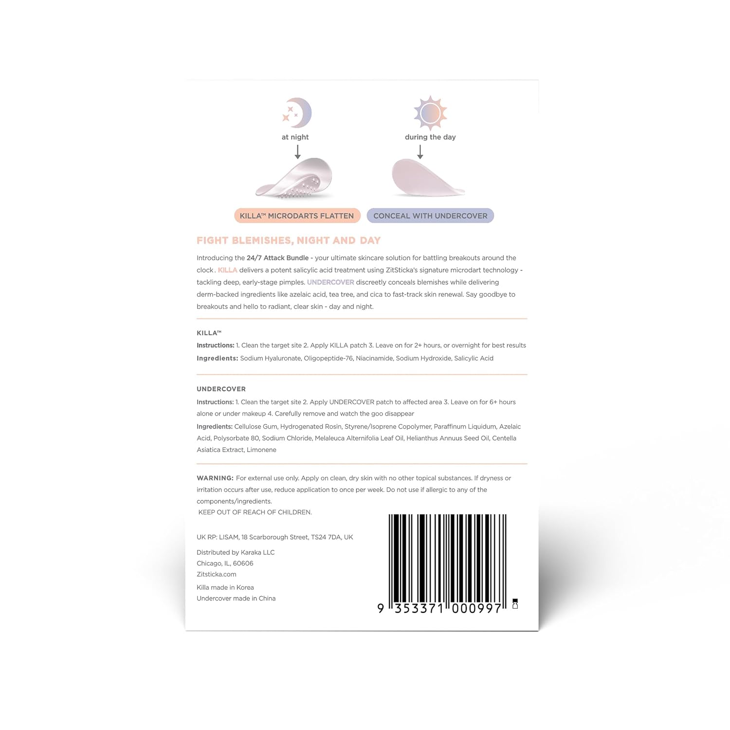 - Dermatologist-Approved Ingredients: Our patches are formulated with clinically proven ingredients to effectively combat breakouts. KILLA patches contain Oligopeptide-76, Niacinamide, and Salicylic Acid. UNDERCOVER hydrocolloid patches are infused with Azelaic Acid, Cica, and Tea Tree to absorb excess fluid and provide faster skin recovery.