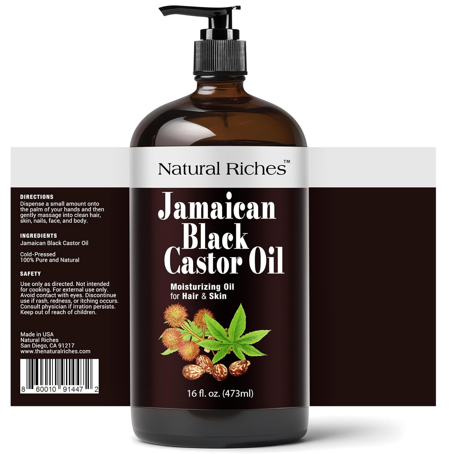 Natural Riches Jamaican Black Castor Oil Glass Bottle Pure Organic Cold Pressed for Hair Growth Skin Care for Dry Skin Conditioning Eyebrows Eyelashes Scalp and Nail Moisturizes & Repairs 16fl.oz.