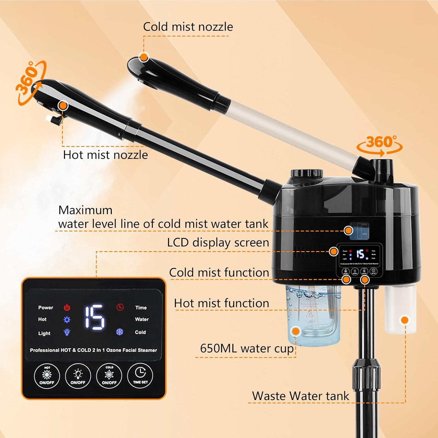 - Adjustable Facial Steamer: This facial steamer is adjustable from 36 inches to 52 inches in height, with a 360-degree rotatable nozzle and 360-degree rotatable body